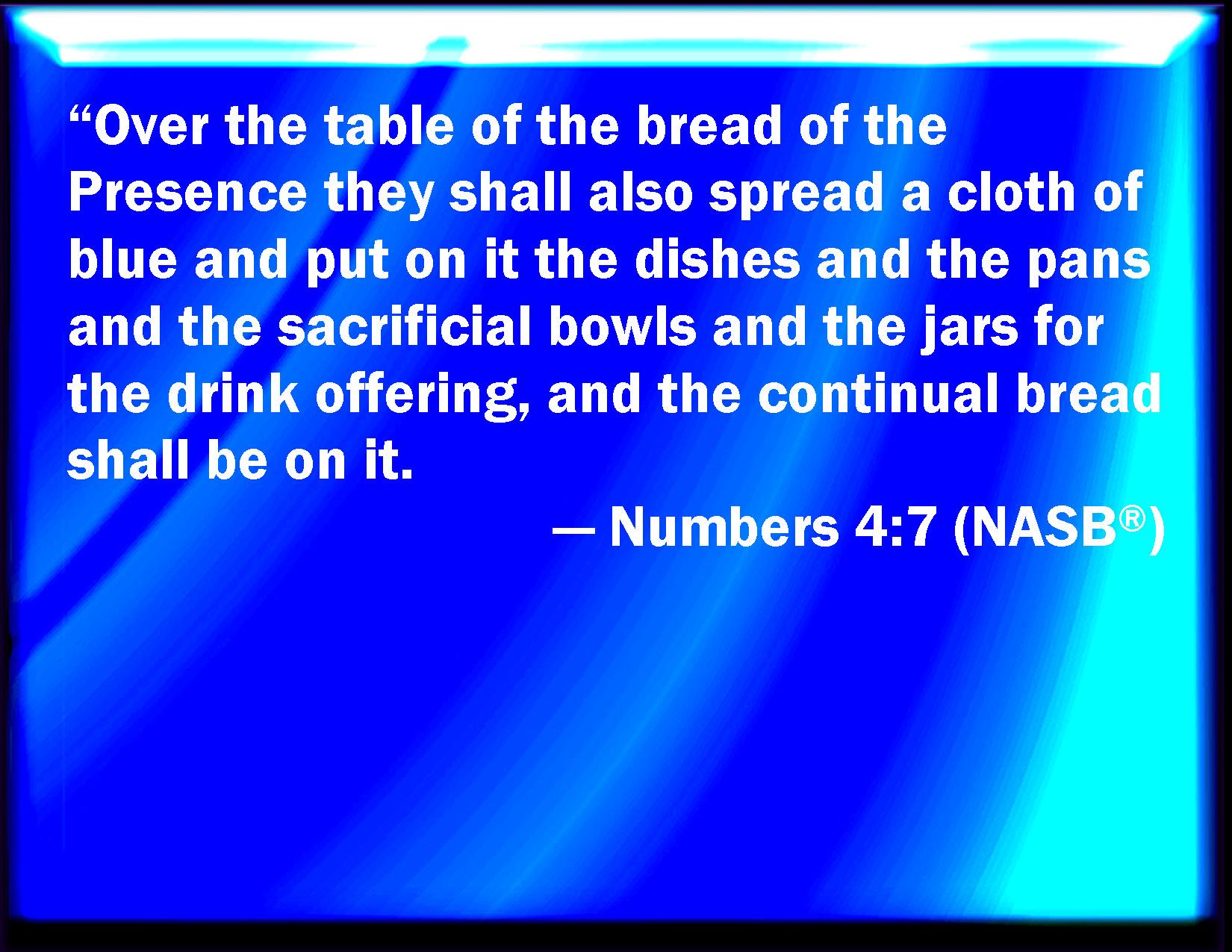 Bible Verse Slide Numbers 4:7 And on the table of show bread they shall spread a cloth of blue, and put thereon the dishes, and the spoons, and the bowls, and covers to cover with: and the continual bread shall be thereon: KJV: And upon the table of shewbread they shall spread a cloth of blue, and put thereon the dishes, and the spoons, and the bowls, and covers to cover withal: and the continual bread shall be thereon: DRB: They shall wrap up also the table of proposition in a cloth of violet, and shall put with it the censers and little mortars, the cups and bowls to pour out the libations: the leaves shall be always on it: DBT: And upon the table of shewbread they shall spread a cloth of blue; and put thereon the dishes, and the cups, and the bowls, and goblets of the drink-offering; and the continual bread shall be thereon. ERV: And upon the table of shewbread they shall spread a cloth of blue, and put thereon the dishes, and the spoons, and the bowls, and the cups to pour out withal: and the continual bread shall be thereon: WBT: And upon the table of show-bread they shall spread a cloth of blue, and put on it the dishes, and the spoons, and the bowls, and covers to cover with: and the continual bread shall be upon it. WEB: "On the table of show bread they shall spread a blue cloth, and put on it the dishes, the spoons, the bowls, and the cups with which to pour out; and the continual bread shall be on it. YLT: 'And on the table of the presence they spread a garment of blue, and have put on it the dishes, and the spoons, and the bowls, and the cups of the libation, and the bread of continuity is on it,Links Numbers 4:7 NIV • Numbers 4:7 NLT • Numbers 4:7 ESV • Numbers 4:7 NASB • Numbers 4:7 KJV • Numbers 4:7 Interlinear • Numbers 4:7 Commentaries • Numbers 4:7 Parallel Texts • Numbers 4:7 Bible Apps • Numbers 4:7 Parallel • Bible Hub |