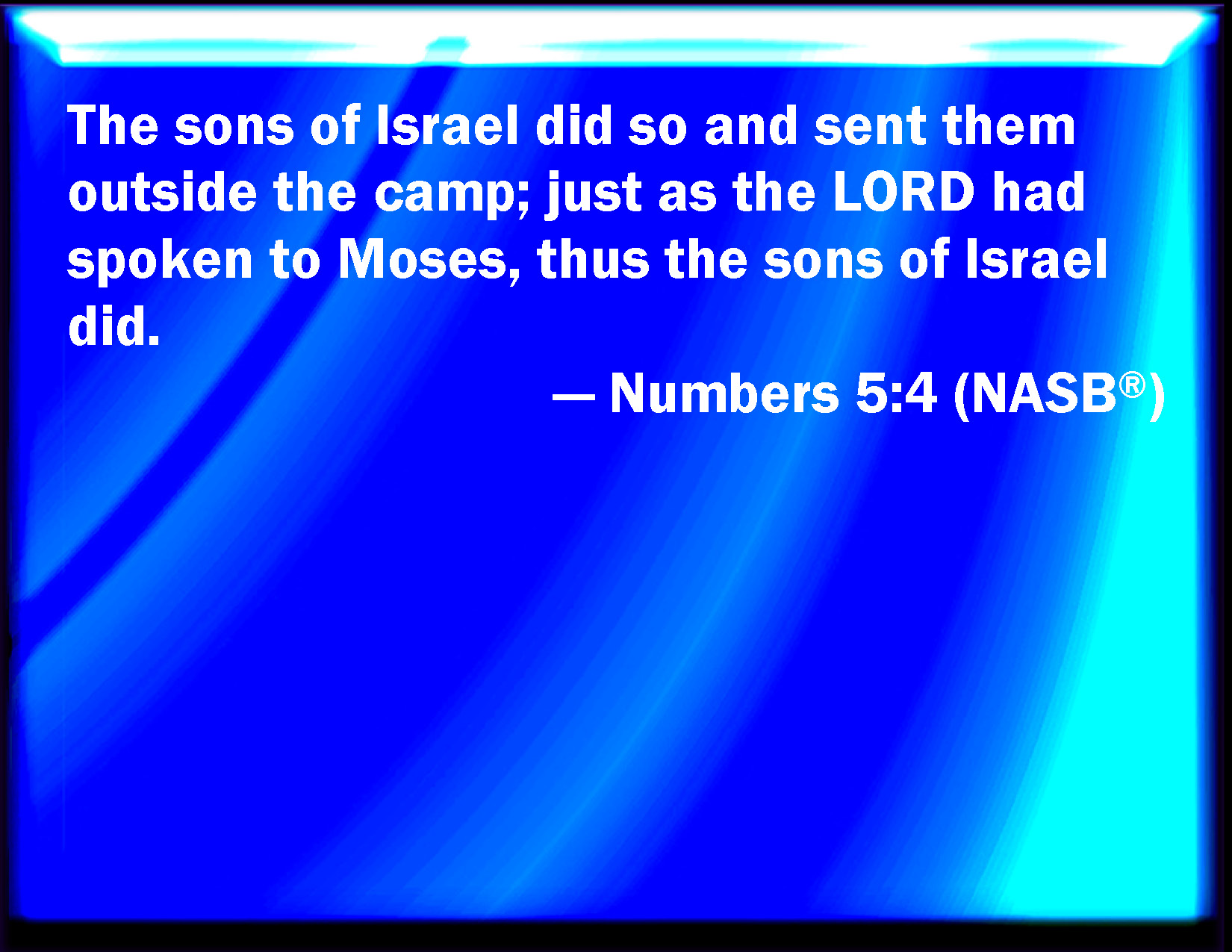 Bible Verse Slide Numbers 5:4 And the children of Israel did so, and put them out without the camp: as the LORD spoke to Moses, so did the children of Israel. KJV: And the children of Israel did so, and put them out without the camp: as the LORD spake unto Moses, so did the children of Israel. DRB: And the children of Israel did so, and they cast them forth without the camp, as the Lord had spoken to Moses. DBT: And the children of Israel did so, and put them outside the camp: as Jehovah had said to Moses, so did the children of Israel. ERV: And the children of Israel did so, and put them out without the camp: as the LORD spake unto Moses, so did the children of Israel. WBT: And the children of Israel did so, and put them out without the camp: as the LORD spoke to Moses, so did the children of Israel. WEB: The children of Israel did so, and put them out outside of the camp; as Yahweh spoke to Moses, so did the children of Israel. YLT: And the sons of Israel do so, and they send them out unto the outside of the camp; as Jehovah hath spoken unto Moses so have the sons of Israel done.Links Numbers 5:4 NIV • Numbers 5:4 NLT • Numbers 5:4 ESV • Numbers 5:4 NASB • Numbers 5:4 KJV • Numbers 5:4 Interlinear • Numbers 5:4 Commentaries • Numbers 5:4 Parallel Texts • Numbers 5:4 Bible Apps • Numbers 5:4 Parallel • Bible Hub |