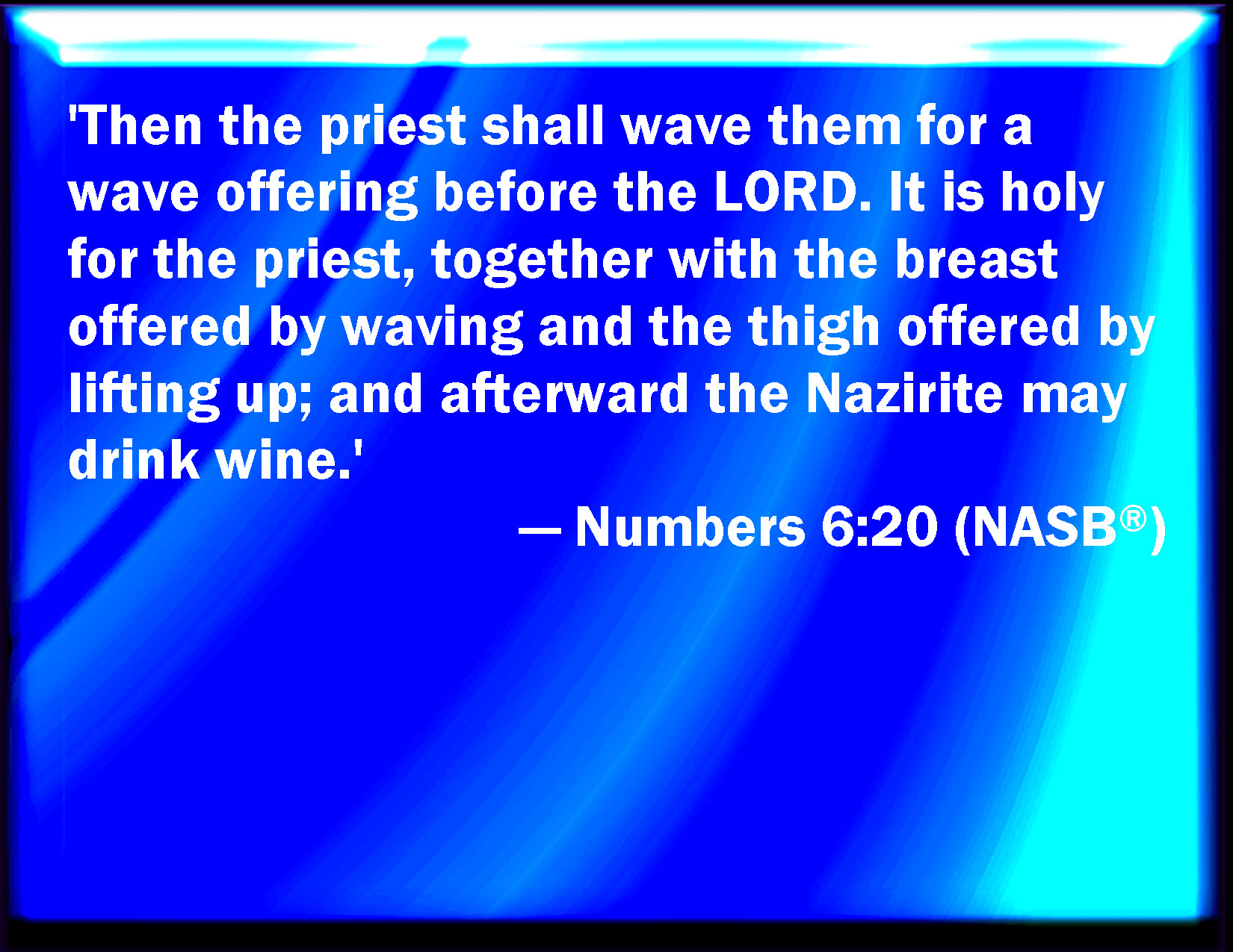 Bible Verse Slide Numbers 6:20 And the priest shall wave them for a wave offering before the LORD: this is holy for the priest, with the wave breast and heave shoulder: and after that the Nazarite may drink wine. KJV: And the priest shall wave them for a wave offering before the LORD: this is holy for the priest, with the wave breast and heave shoulder: and after that the Nazarite may drink wine. DRB: And receiving them again from him, he shall elevate them in the sight of the Lord: and they being sanctified shall belong to the priest, as the breast, which was commanded to be separated, and the shoulder. After this the Nazarite may drink wine. DBT: And the priest shall wave them as wave-offering before Jehovah; it is holy for the priest, with the breast of the wave-offering and with the shoulder of the heave-offering; and afterwards the Nazarite may drink wine. ERV: and the priest shall wave them for a wave offering before the LORD; this is holy for the priest, together with the wave breast and heave thigh: and after that the Nazirite may drink wine. WBT: And the priest shall wave them for a wave-offering before the LORD: this is holy for the priest, with the wave-breast, and heave-shoulder: and after that, the Nazarite may drink wine. WEB: and the priest shall wave them for a wave offering before Yahweh. This is holy for the priest, together with the breast that is waved and the thigh that is offered. After that the Nazirite may drink wine. YLT: and the priest hath waved them, a wave-offering before Jehovah; it is holy to the priest, besides the breast of the wave-offering, and besides the leg of the heave-offering; and afterwards doth the Nazarite drink wine.Links Numbers 6:20 NIV • Numbers 6:20 NLT • Numbers 6:20 ESV • Numbers 6:20 NASB • Numbers 6:20 KJV • Numbers 6:20 Interlinear • Numbers 6:20 Commentaries • Numbers 6:20 Parallel Texts • Numbers 6:20 Bible Apps • Numbers 6:20 Parallel • Bible Hub |