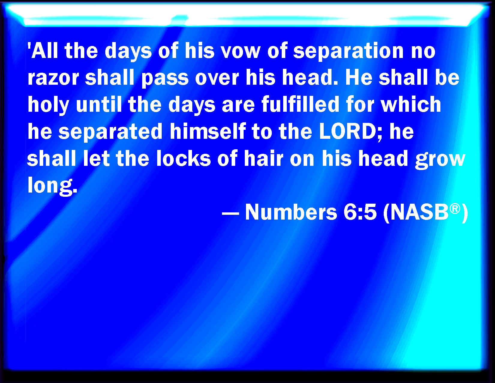 Bible Verse Slide Numbers 6:5 All the days of the vow of his separation there shall no razor come on his head: until the days be fulfilled, in the which he separates himself to the LORD, he shall be holy, and shall let the locks of the hair of his head grow. KJV: All the days of the vow of his separation there shall no rasor come upon his head: until the days be fulfilled, in the which he separateth himself unto the LORD, he shall be holy, and shall let the locks of the hair of his head grow. DRB: All the time of his separation no razor shall pass over his head, until the day be fulfilled of his consecration to the Lord. He shall be holy, and shall let the hair of his head grow. DBT: All the days of the vow of his separation there shall no razor come upon his head; until the days be fulfilled, that he hath consecrated himself to Jehovah, he shall be holy; he shall let the locks of the hair of his head grow. ERV: All the days of his vow of separation there shall no razor come upon his head: until the days be fulfilled, in the which he separateth himself unto the LORD, he shall be holy, he shall let the locks of the hair of his head grow long. WBT: All the days of the vow of his separation there shall no razor come upon his head: until the days shall be fulfilled, in which he separateth himself to the LORD, he shall be holy, and shall let the locks of the hair of his head grow. WEB: "'All the days of his vow of separation no razor shall come on his head, until the days are fulfilled, in which he separates himself to Yahweh. He shall be holy. He shall let the locks of the hair of his head grow long. YLT: 'All days of the vow of his separation a razor doth not pass over his head; till the fulness of the days which he doth separate to Jehovah he is holy; grown up hath the upper part of the hair of his head.Links Numbers 6:5 NIV • Numbers 6:5 NLT • Numbers 6:5 ESV • Numbers 6:5 NASB • Numbers 6:5 KJV • Numbers 6:5 Interlinear • Numbers 6:5 Commentaries • Numbers 6:5 Parallel Texts • Numbers 6:5 Bible Apps • Numbers 6:5 Parallel • Bible Hub |