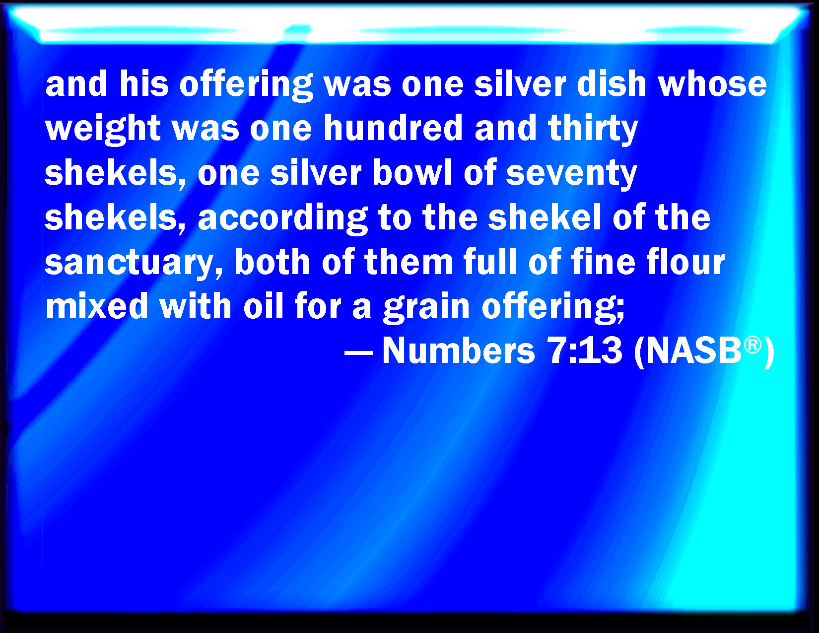 Bible Verse Slide Numbers 7:13 And his offering was one silver charger, the weight thereof was an hundred and thirty shekels, one silver bowl of seventy shekels, after the shekel of the sanctuary; both of them were full of fine flour mingled with oil for a meat offering: KJV: And his offering was one silver charger, the weight thereof was an hundred and thirty shekels, one silver bowl of seventy shekels, after the shekel of the sanctuary; both of them were full of fine flour mingled with oil for a meat offering: DRB: And his offering was a silver dish weighing one hundred and thirty sides, a silver bowl of seventy sides according to the weight of the sanctuary, both full of flour tempered with oil for sacrifice: DBT: And his offering was one silver dish of the weight of a hundred and thirty shekels, one silver bowl, of seventy shekels, according to the shekel of the sanctuary, both of them full of fine flour mingled with oil for an oblation; ERV: and his oblation was one silver charger, the weight thereof was an hundred and thirty shekels, one silver bowl of seventy shekels, after the shekel of the sanctuary; both of them full of fine flour mingled with oil for a meal offering; WBT: And his offering was one silver charger, the weight of which was a hundred and thirty shekels, one silver bowl of seventy shekels, after the shekel of the sanctuary; both of them were full of fine flour mingled with oil for a meat-offering: WEB: and his offering was: one silver platter, the weight of which was one hundred thirty shekels, one silver bowl of seventy shekels, after the shekel of the sanctuary; both of them full of fine flour mixed with oil for a meal offering; YLT: And his offering is one silver dish, its weight a hundred and thirty shekels; one silver bowl of seventy shekels, by the shekel of the sanctuary; both of them full of flour mixed with oil, for a present;Links Numbers 7:13 NIV • Numbers 7:13 NLT • Numbers 7:13 ESV • Numbers 7:13 NASB • Numbers 7:13 KJV • Numbers 7:13 Interlinear • Numbers 7:13 Commentaries • Numbers 7:13 Parallel Texts • Numbers 7:13 Bible Apps • Numbers 7:13 Parallel • Bible Hub |
