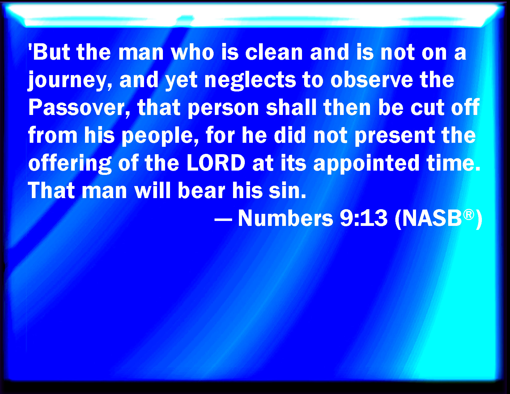 Bible Verse Slide Numbers 9:13 But the man that is clean, and is not in a journey, and declines to keep the passover, even the same soul shall be cut off from among his people: because he brought not the offering of the LORD in his appointed season, that man shall bear his sin. KJV: But the man that is clean, and is not in a journey, and forbeareth to keep the passover, even the same soul shall be cut off from among his people: because he brought not the offering of the LORD in his appointed season, that man shall bear his sin. DRB: But if any man is clean, and was not on a journey, and did not make the phase, that soul shall be cut off from among his people, because he offered not sacrifice to the Lord in due season: he shall bear his sin. DBT: But a man that is clean, and is not on a journey, and forbeareth to hold the passover, that soul shall be cut off from among his peoples; because he presented not the offering of Jehovah at its set time: that man shall bear his sin. ERV: But the man that is clean, and is not in a journey, and forbeareth to keep the passover, that soul shall be cut off from his people: because he offered not the oblation of the LORD in its appointed season, that man shall bear his sin. WBT: But the man that is clean, and is not in a journey, and forbeareth to keep the passover, even the same soul shall be cut off from among his people: because he brought not the offering of the LORD in its appointed season, that man shall bear his sin. WEB: But the man who is clean, and is not on a journey, and fails to keep the Passover, that soul shall be cut off from his people. Because he didn't offer the offering of Yahweh in its appointed season, that man shall bear his sin. YLT: 'And the man who is clean, and hath not been on a journey, and hath ceased to prepare the passover, even that person hath been cut off from his people; because the offering of Jehovah he hath not brought near, in its appointed season, that man doth bear his sin.Links Numbers 9:13 NIV • Numbers 9:13 NLT • Numbers 9:13 ESV • Numbers 9:13 NASB • Numbers 9:13 KJV • Numbers 9:13 Interlinear • Numbers 9:13 Commentaries • Numbers 9:13 Parallel Texts • Numbers 9:13 Bible Apps • Numbers 9:13 Parallel • Bible Hub |