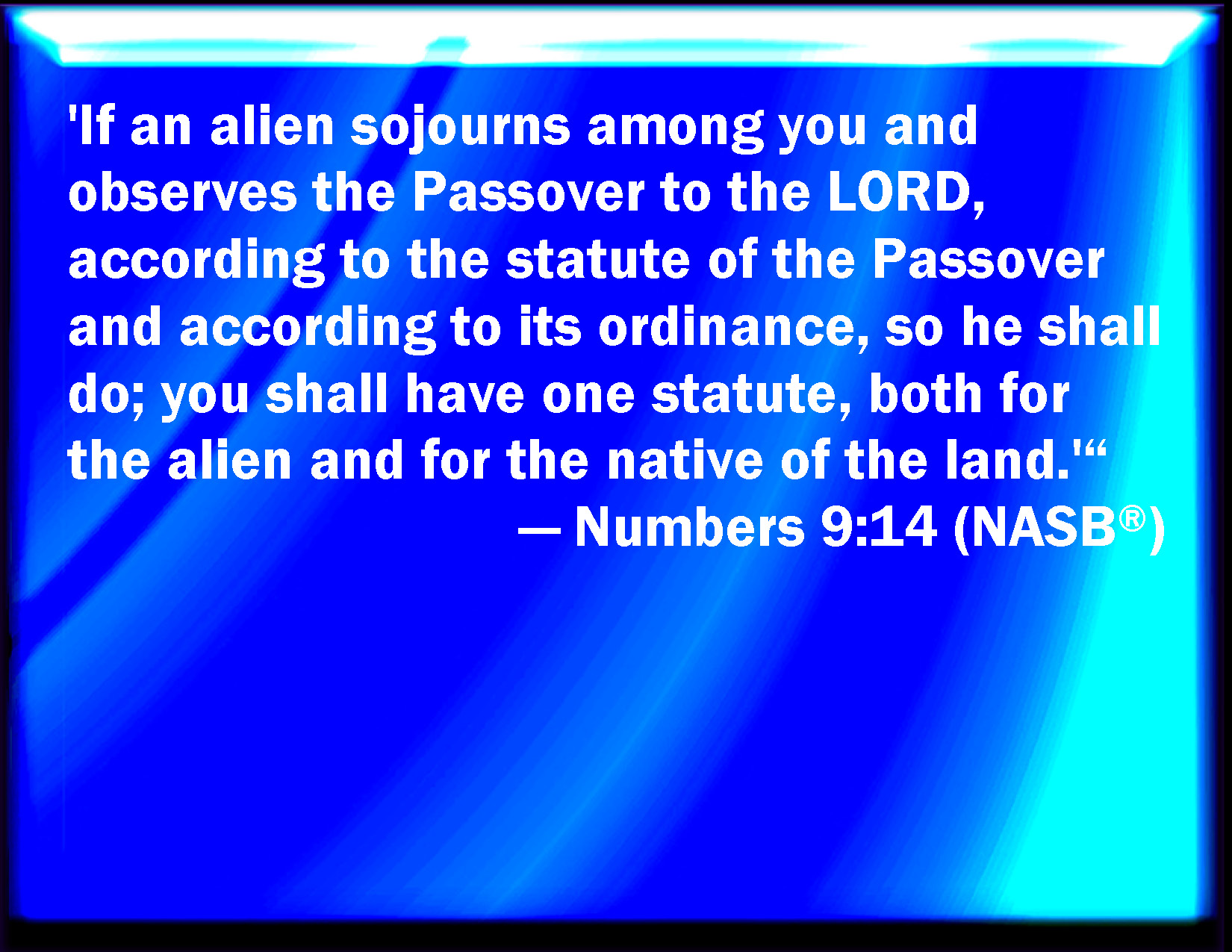 Bible Verse Slide Numbers 9:14 And if a stranger shall sojourn among you, and will keep the passover to the LORD; according to the ordinance of the passover, and according to the manner thereof, so shall he do: you shall have one ordinance, both for the stranger, and for him that was born in the land. KJV: And if a stranger shall sojourn among you, and will keep the passover unto the LORD; according to the ordinance of the passover, and according to the manner thereof, so shall he do: ye shall have one ordinance, both for the stranger, and for him that was born in the land. DRB: The sojourner also and the stranger if they be among you, shall make the phase to the Lord according to the ceremonies and justifications thereof. The same ordinance shall be with you both for the stranger, and for him that was born in the land. DBT: And if a stranger shall sojourn among you, and would hold the passover to Jehovah, according to the rite of the passover, and according to the ordinance thereof, so shall he do. Ye shall have one rite, both for the stranger and for him that is born in the land. ERV: And if a stranger shall sojourn among you, and will keep the passover unto the LORD; according to the statute of the passover, and according to the ordinance thereof, so shall he do: ye shall have one statute, both for the stranger, and for him that is born in the land. WBT: And if a stranger shall sojourn among you, and will keep the passover to the LORD; according to the ordinance of the passover, and according to the manner of it, so shall he do: ye shall have one ordinance both for the stranger, and for him that was born in the land. WEB: "'If a foreigner lives among you, and desires to keep the Passover to Yahweh; according to the statute of the Passover, and according to its ordinance, so shall he do. You shall have one statute, both for the foreigner, and for him who is born in the land.'" YLT: 'And when a sojourner sojourneth with you, then he hath prepared a passover to Jehovah, according to the statute of the passover, and according to its ordinance, so he doth; one statute is to you, even to a sojourner, and to a native of the land.'Links Numbers 9:14 NIV • Numbers 9:14 NLT • Numbers 9:14 ESV • Numbers 9:14 NASB • Numbers 9:14 KJV • Numbers 9:14 Interlinear • Numbers 9:14 Commentaries • Numbers 9:14 Parallel Texts • Numbers 9:14 Bible Apps • Numbers 9:14 Parallel • Bible Hub |