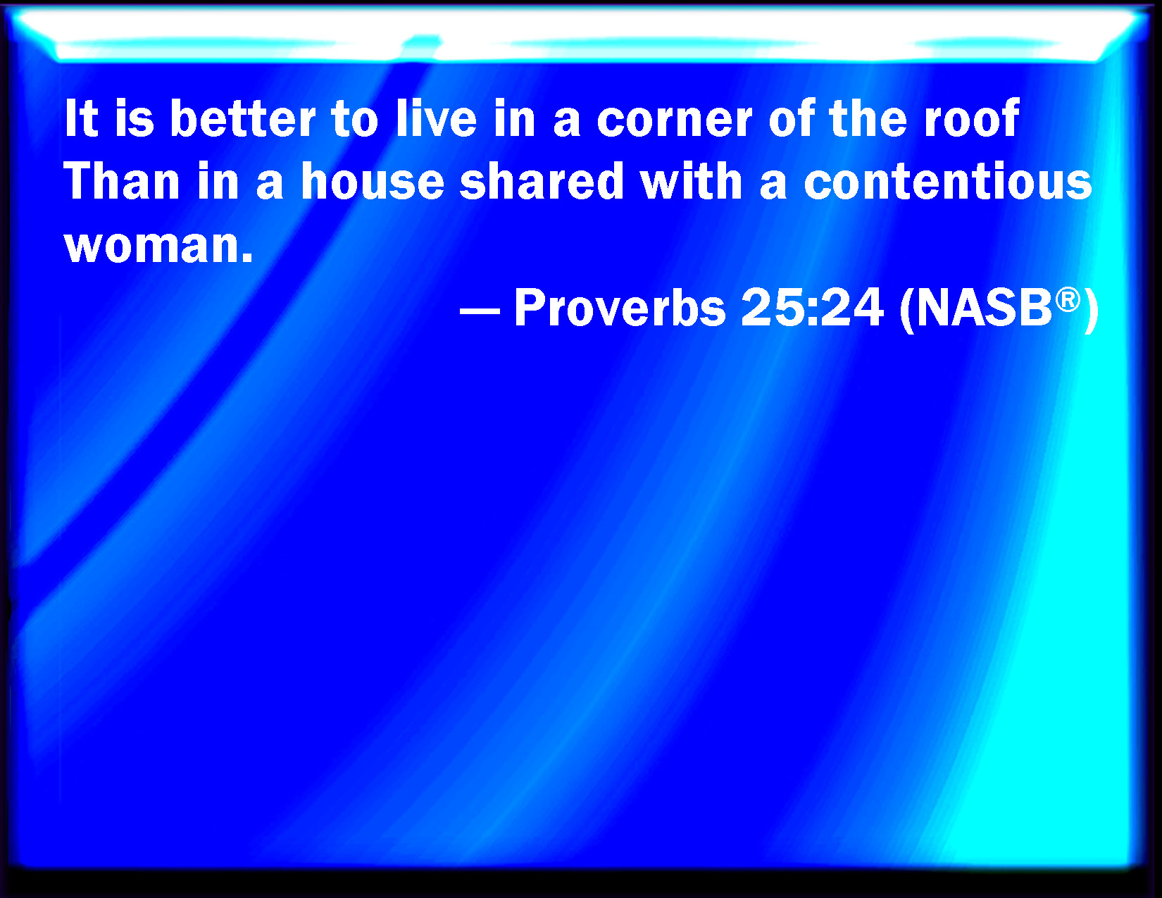 Bible Verse Slide Proverbs 25:24 It is better to dwell in the corner of the housetop, than with a brawling woman and in a wide house. KJV: It is better to dwell in the corner of the housetop, than with a brawling woman and in a wide house. DRB: It is better to sit m a corner of the housetop, than with a brawling woman, and in a common house. DBT: It is better to dwell in a corner of the housetop, than with a contentious woman, and a house in common. ERV: It is better to dwell in the comer of the housetop, than with a contentious woman in a wide house. WBT: It is better to dwell in a corner of the house-top, than with a brawling woman and in a wide house. WEB: It is better to dwell in the corner of the housetop, than to share a house with a contentious woman. YLT: Better to sit on a corner of a roof, Than with a woman of contentions, and a house of company.Links Proverbs 25:24 NIV • Proverbs 25:24 NLT • Proverbs 25:24 ESV • Proverbs 25:24 NASB • Proverbs 25:24 KJV • Proverbs 25:24 Interlinear • Proverbs 25:24 Commentaries • Proverbs 25:24 Parallel Texts • Proverbs 25:24 Bible Apps • Proverbs 25:24 Parallel • Bible Hub |
