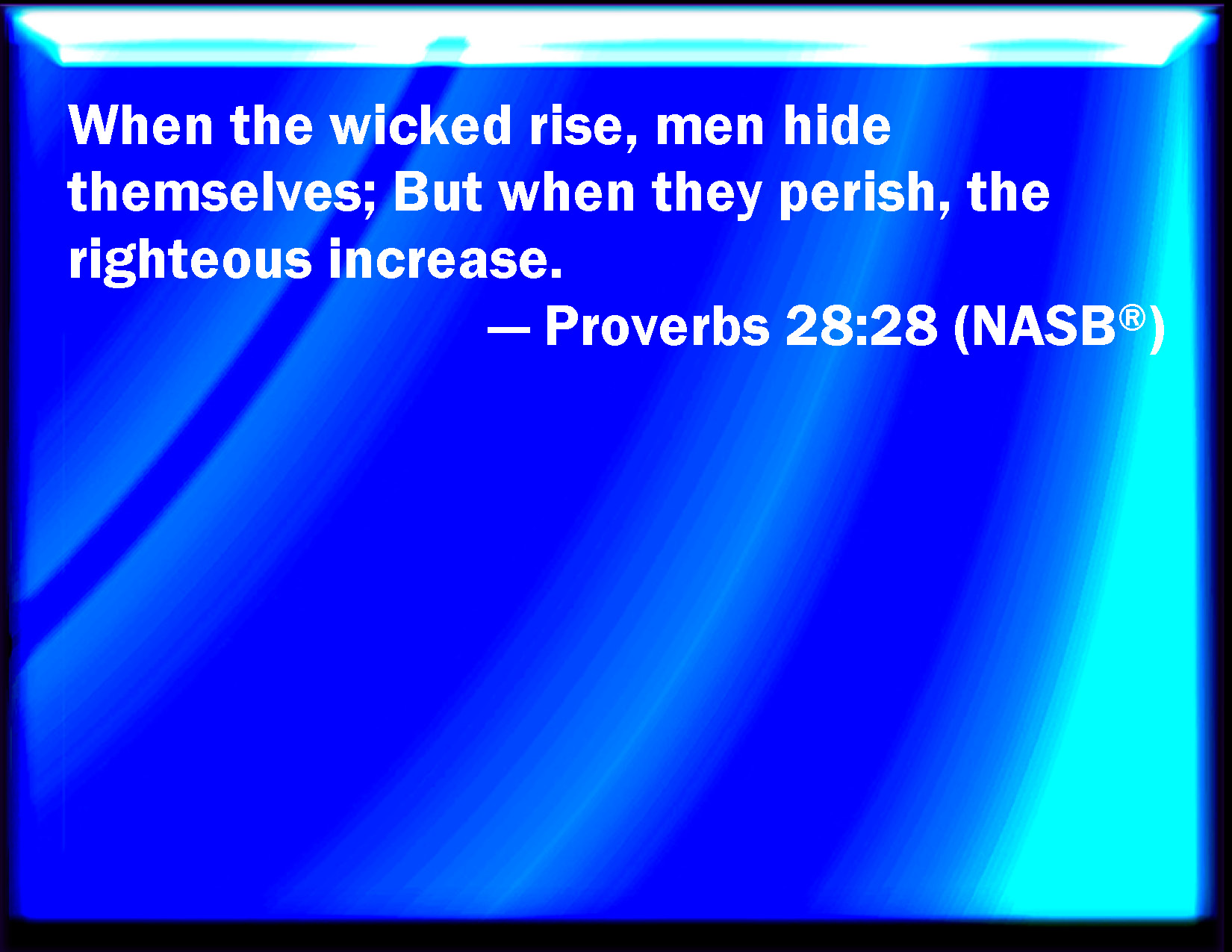 Bible Verse Slide Proverbs 28:28 When the wicked rise, men hide themselves: but when they perish, the righteous increase. KJV: When the wicked rise, men hide themselves: but when they perish, the righteous increase. DRB: When the wicked rise up, men shall hide themselves: when they perish, the lust shall be multiplied. DBT: When the wicked rise, men hide themselves; but when they perish, the righteous increase. ERV: When the wicked rise, men hide themselves: but when they perish, the righteous increase. WBT: When the wicked rise, men hide themselves: but when they perish, the righteous increase. WEB: When the wicked rise, men hide themselves; but when they perish, the righteous thrive. YLT: In the rising of the wicked a man is hidden, And in their destruction the righteous multiply!Links Proverbs 28:28 NIV • Proverbs 28:28 NLT • Proverbs 28:28 ESV • Proverbs 28:28 NASB • Proverbs 28:28 KJV • Proverbs 28:28 Interlinear • Proverbs 28:28 Commentaries • Proverbs 28:28 Parallel Texts • Proverbs 28:28 Bible Apps • Proverbs 28:28 Parallel • Bible Hub |
