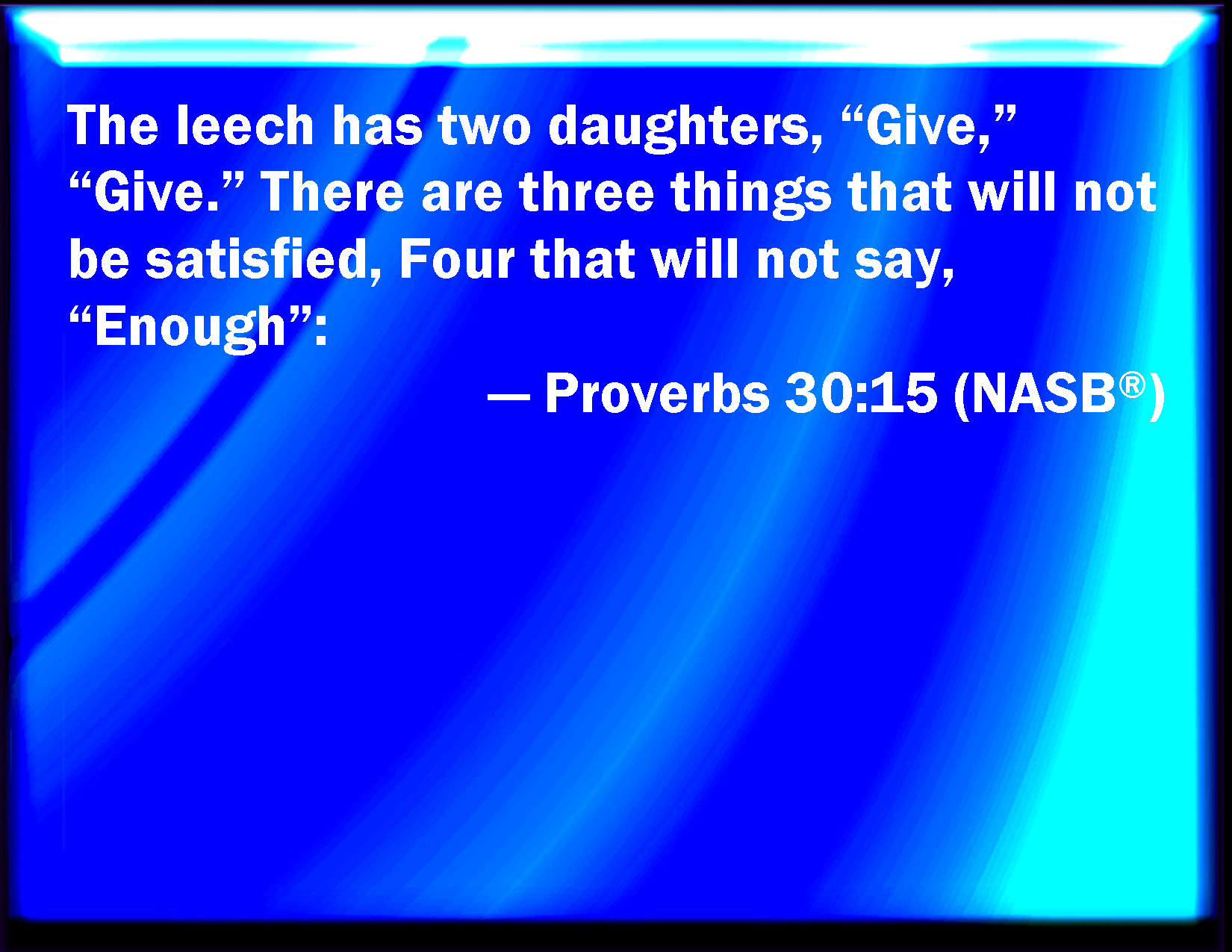 Bible Verse Slide Proverbs 30:15 The horse leach has two daughters, crying, Give, give. There are three things that are never satisfied, yes, four things say not, It is enough: KJV: The horseleach hath two daughters, crying, Give, give. There are three things that are never satisfied, yea, four things say not, It is enough: DRB: The horseleech hath two daughters that say: Bring, bring. There are three things that never are satisfied, and the fourth never saith: It is enough. DBT: The leech hath two daughters: Give, give. There are three things never satisfied; four which say not, It is enough: ERV: The horseleach hath two daughters, Crying, Give, give. There are three things that are never satisfied, yea, four that say not, Enough: WBT: The horse-leech hath two daughters, crying, Give, give. There are three things that are never satisfied, yes, four things say not, It is enough: WEB: "The leach has two daughters: 'Give, give.' "There are three things that are never satisfied; four that don't say, 'Enough:' YLT: To the leech are two daughters, 'Give, give, Lo, three things are not satisfied, Four have not said 'Sufficiency;'Links Proverbs 30:15 NIV • Proverbs 30:15 NLT • Proverbs 30:15 ESV • Proverbs 30:15 NASB • Proverbs 30:15 KJV • Proverbs 30:15 Interlinear • Proverbs 30:15 Commentaries • Proverbs 30:15 Parallel Texts • Proverbs 30:15 Bible Apps • Proverbs 30:15 Parallel • Bible Hub |