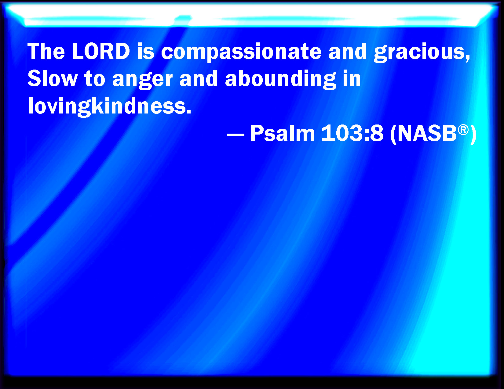 Bible Verse Slide Psalm 103:8 The LORD is merciful and gracious, slow to anger, and plenteous in mercy. KJV: The LORD is merciful and gracious, slow to anger, and plenteous in mercy. DRB: The ford is compassionate and merciful: longsuffering and plenteous in mercy. DBT: Jehovah is merciful and gracious, slow to anger, and abundant in loving-kindness. ERV: The LORD is full of compassion and gracious, slow to anger, and plenteous in mercy. WBT: The LORD is merciful and gracious, slow to anger, and abundant in mercy. WEB: Yahweh is merciful and gracious, slow to anger, and abundant in loving kindness. YLT: Merciful and gracious is Jehovah, Slow to anger, and abundant in mercy.Links Psalm 103:8 NIV • Psalm 103:8 NLT • Psalm 103:8 ESV • Psalm 103:8 NASB • Psalm 103:8 KJV • Psalm 103:8 Interlinear • Psalm 103:8 Commentaries • Psalm 103:8 Parallel Texts • Psalm 103:8 Bible Apps • Psalm 103:8 Parallel • Bible Hub |