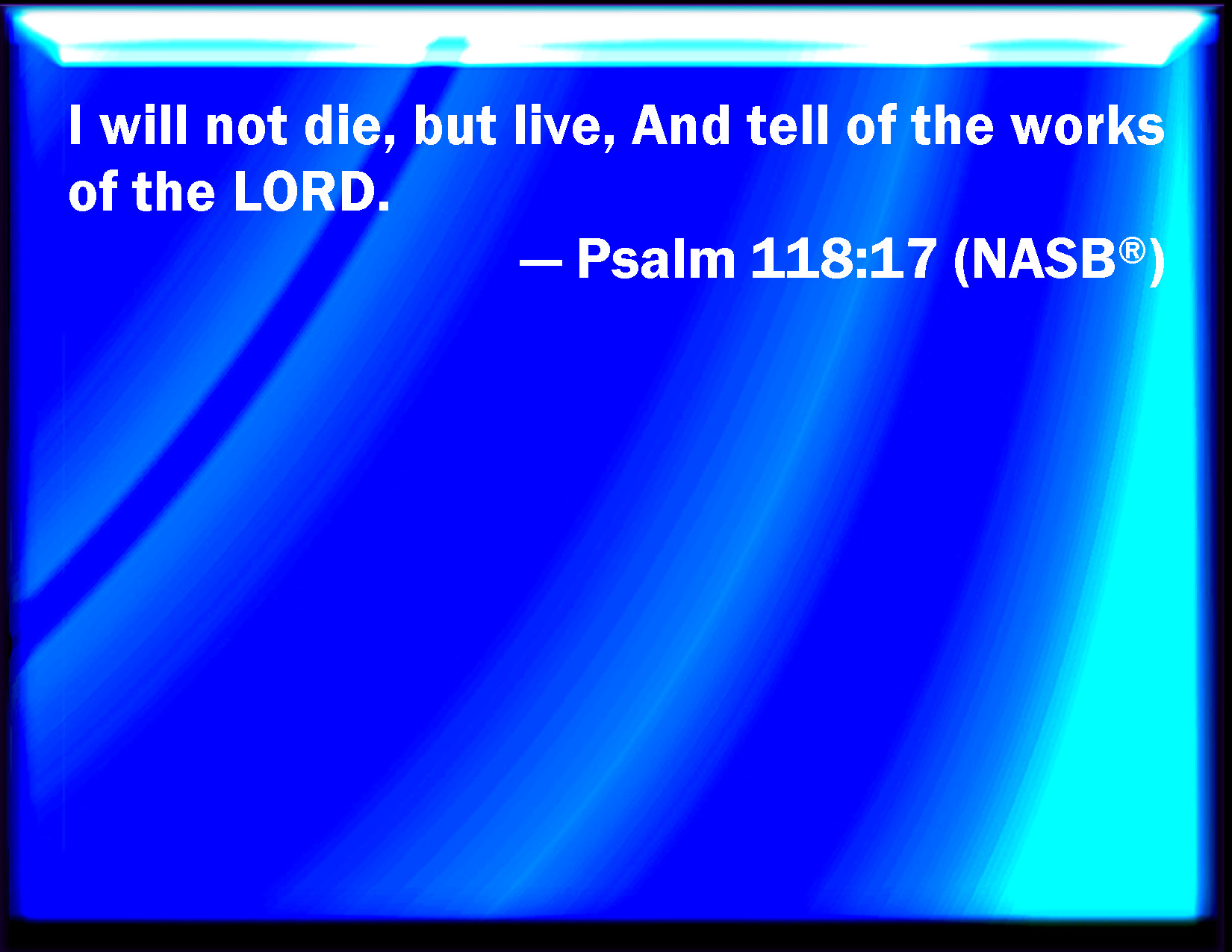 Bible Verse Slide Psalm 118:17 I shall not die, but live, and declare the works of the LORD. KJV: I shall not die, but live, and declare the works of the LORD. DRB: I shall not die, but live: and shall declare the works of the Lord. DBT: I shall not die, but live, and declare the works of Jah. ERV: I shall not die, but live, and declare the works of the LORD. WBT: I shall not die, but live, and declare the works of the LORD. WEB: I will not die, but live, and declare Yah's works. YLT: I do not die, but live, And recount the works of Jah,Links Psalm 118:17 NIV • Psalm 118:17 NLT • Psalm 118:17 ESV • Psalm 118:17 NASB • Psalm 118:17 KJV • Psalm 118:17 Interlinear • Psalm 118:17 Commentaries • Psalm 118:17 Parallel Texts • Psalm 118:17 Bible Apps • Psalm 118:17 Parallel • Bible Hub |