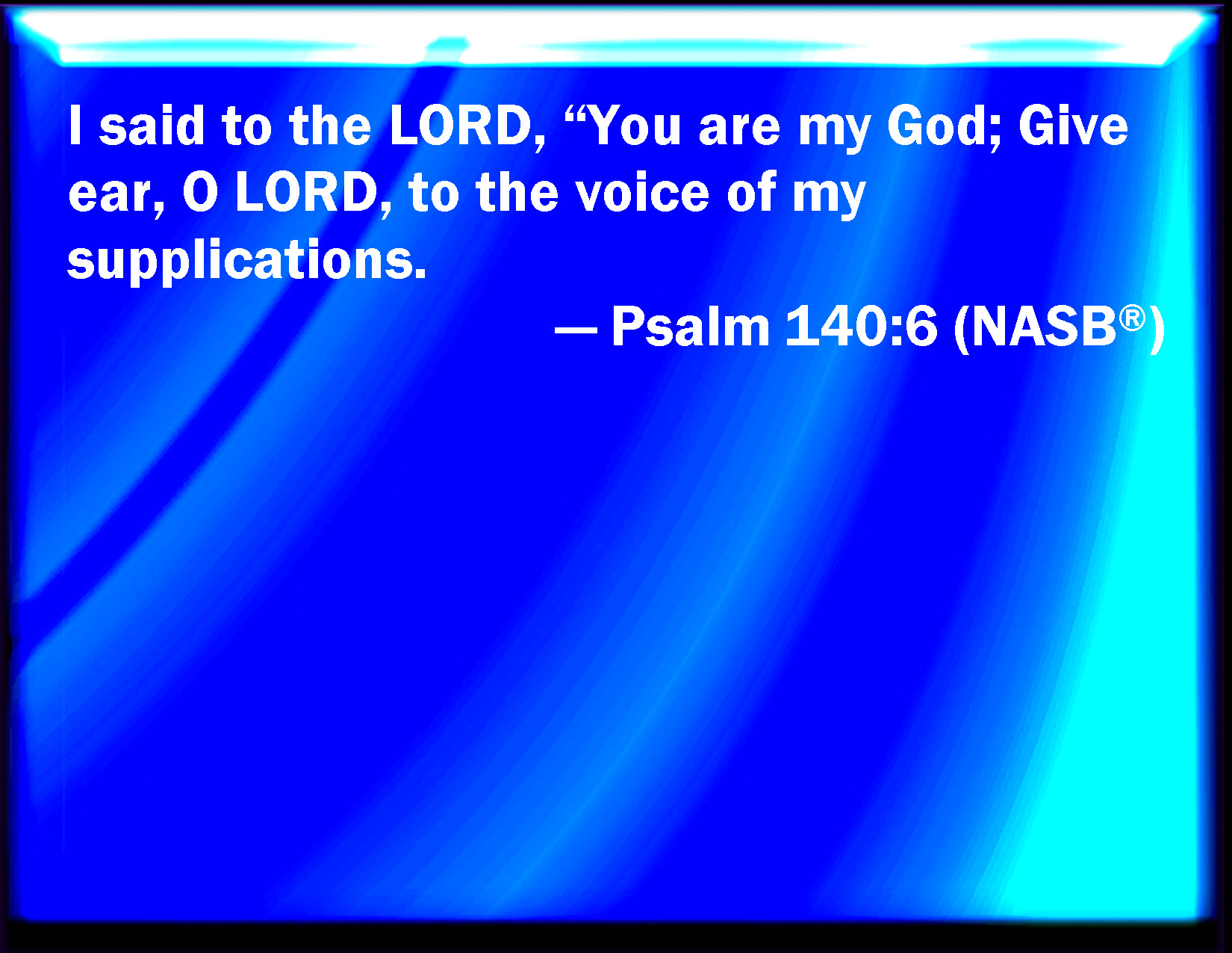 Bible Verse Slide Psalm 140:6 I said to the LORD, You are my God: hear the voice of my supplications, O LORD. KJV: I said unto the LORD, Thou art my God: hear the voice of my supplications, O LORD. DRB: I said to the Lord: Thou art my God: hear, O Lord, the voice of my supplication. DBT: I have said unto Jehovah, Thou art my God: give ear, O Jehovah, to the voice of my supplications. ERV: I said unto the LORD, Thou art my God: give ear unto the voice of my supplications, O LORD. WBT: I said to the LORD, Thou art my God: hear the voice of my supplications, O LORD. WEB: I said to Yahweh, "You are my God." Listen to the cry of my petitions, Yahweh. YLT: I have said to Jehovah, 'My God art Thou, Hear, Jehovah, the voice of my supplications.'Links Psalm 140:6 NIV • Psalm 140:6 NLT • Psalm 140:6 ESV • Psalm 140:6 NASB • Psalm 140:6 KJV • Psalm 140:6 Interlinear • Psalm 140:6 Commentaries • Psalm 140:6 Parallel Texts • Psalm 140:6 Bible Apps • Psalm 140:6 Parallel • Bible Hub |