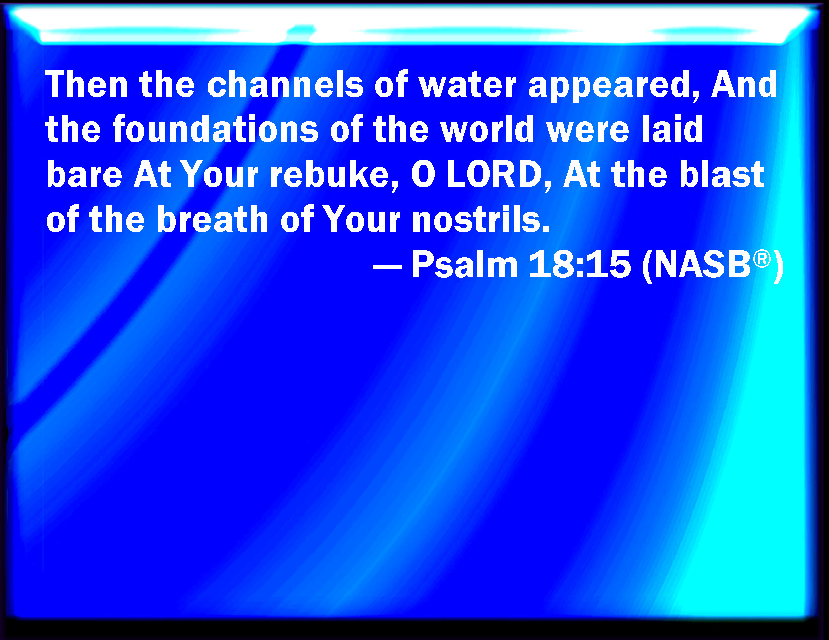 Bible Verse Slide Psalm 18:15 Then the channels of waters were seen, and the foundations of the world were discovered at your rebuke, O LORD, at the blast of the breath of your nostrils. KJV: Then the channels of waters were seen, and the foundations of the world were discovered at thy rebuke, O LORD, at the blast of the breath of thy nostrils. DRB: Then the fountains of waters appeared, and the foundations of the world were discovered: At thy rebuke, O Lord, at the blast of the spirit of thy wrath. DBT: And the beds of the waters were seen, and the foundations of the world were uncovered at thy rebuke, Jehovah, at the blast of the breath of thy nostrils. ERV: Then the channels of waters appeared, and the foundations of the world were laid bare, at thy rebuke, O LORD, at the blast of the breath of thy nostrils. WBT: Then the channels of waters were seen, and the foundations of the world were uncovered at thy rebuke, O LORD, at the blast of the breath of thy nostrils. WEB: Then the channels of waters appeared. The foundations of the world were laid bare at your rebuke, Yahweh, at the blast of the breath of your nostrils. YLT: And seen are the streams of waters, And revealed are foundations of the earth. From Thy rebuke, O Jehovah, From the breath of the spirit of Thine anger.Links Psalm 18:15 NIV • Psalm 18:15 NLT • Psalm 18:15 ESV • Psalm 18:15 NASB • Psalm 18:15 KJV • Psalm 18:15 Interlinear • Psalm 18:15 Commentaries • Psalm 18:15 Parallel Texts • Psalm 18:15 Bible Apps • Psalm 18:15 Parallel • Bible Hub |