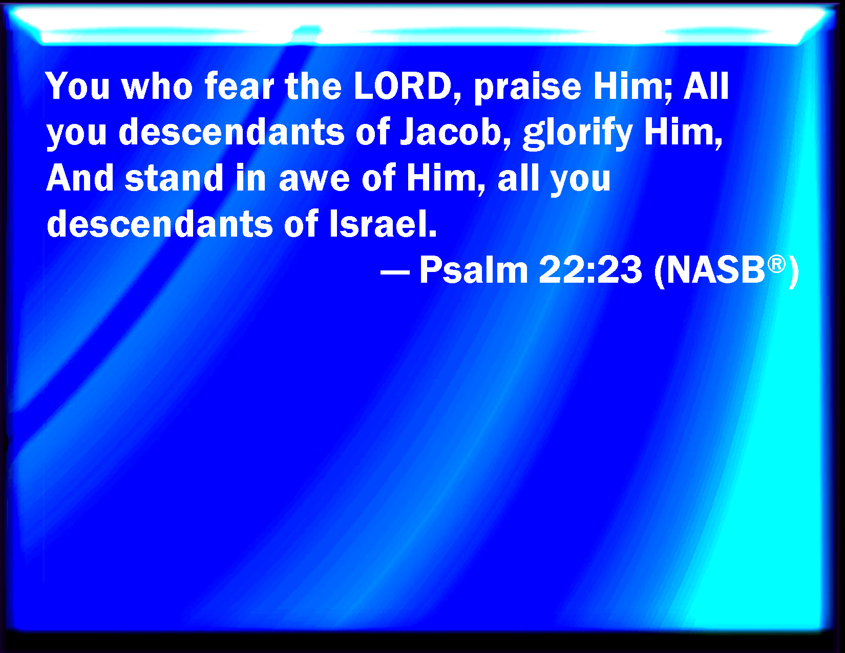 Bible Verse Slide Psalm 22:23 You that fear the LORD, praise him; all you the seed of Jacob, glorify him; and fear him, all you the seed of Israel. KJV: Ye that fear the LORD, praise him; all ye the seed of Jacob, glorify him; and fear him, all ye the seed of Israel. DRB: Ye that fear the Lord, praise him: all ye the seed of Jacob, glorify him. DBT: Ye that fear Jehovah, praise him; all ye the seed of Jacob, glorify him; and revere him, all ye the seed of Israel. ERV: Ye that fear the LORD, praise him; all ye the seed of Jacob, glorify him; and stand in awe of him, all ye the seed of Israel. WBT: Ye that fear the LORD, praise him; all ye the seed of Jacob, glorify him; and fear him, all ye the seed of Israel. WEB: You who fear Yahweh, praise him! All you descendants of Jacob, glorify him! Stand in awe of him, all you descendants of Israel! YLT: Ye who fear Jehovah, praise ye Him, All the seed of Jacob, honour ye Him, And be afraid of Him, all ye seed of Israel.Links Psalm 22:23 NIV • Psalm 22:23 NLT • Psalm 22:23 ESV • Psalm 22:23 NASB • Psalm 22:23 KJV • Psalm 22:23 Interlinear • Psalm 22:23 Commentaries • Psalm 22:23 Parallel Texts • Psalm 22:23 Bible Apps • Psalm 22:23 Parallel • Bible Hub |