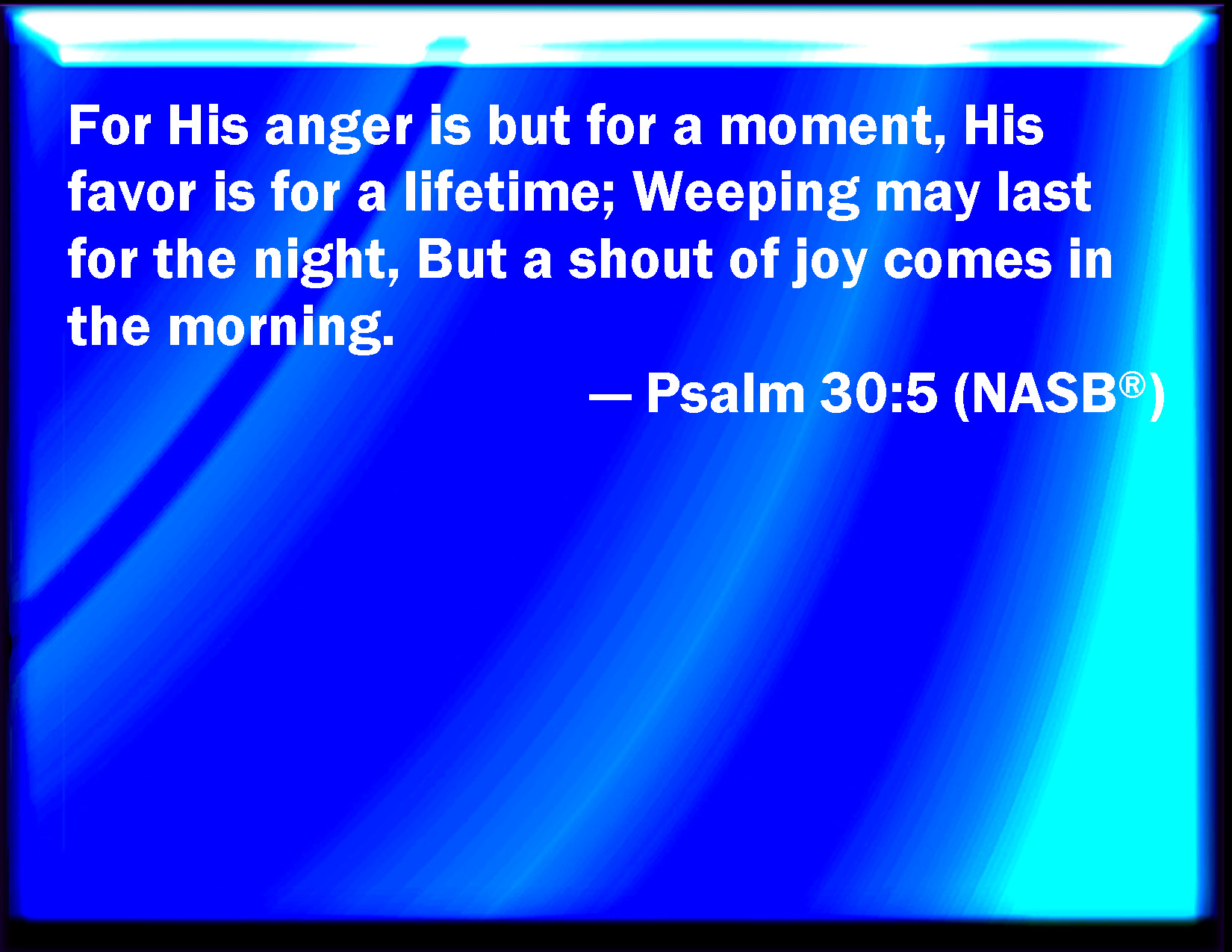 Bible Verse Slide Psalm 30:5 For his anger endures but a moment; in his favor is life: weeping may endure for a night, but joy comes in the morning. KJV: For his anger endureth but a moment; in his favour is life: weeping may endure for a night, but joy cometh in the morning. DRB: For wrath is in his indignation; and life in his good will. In the evening weeping shall have place, and in the morning gladness. DBT: For a moment is passed in his anger, a life in his favour; at even weeping cometh for the night, and at morn there is rejoicing. ERV: For his anger is but for a moment; in his favour is life: weeping may tarry for the night, but joy cometh in the morning. WBT: For his anger endureth but a moment; in his favor is life: weeping may endure for a night, but joy cometh in the morning. WEB: For his anger is but for a moment. His favor is for a lifetime. Weeping may stay for the night, but joy comes in the morning. YLT: For — a moment is in His anger, Life is in His good-will, At even remaineth weeping, and at morn singing.Links Psalm 30:5 NIV • Psalm 30:5 NLT • Psalm 30:5 ESV • Psalm 30:5 NASB • Psalm 30:5 KJV • Psalm 30:5 Interlinear • Psalm 30:5 Commentaries • Psalm 30:5 Parallel Texts • Psalm 30:5 Bible Apps • Psalm 30:5 Parallel • Bible Hub |