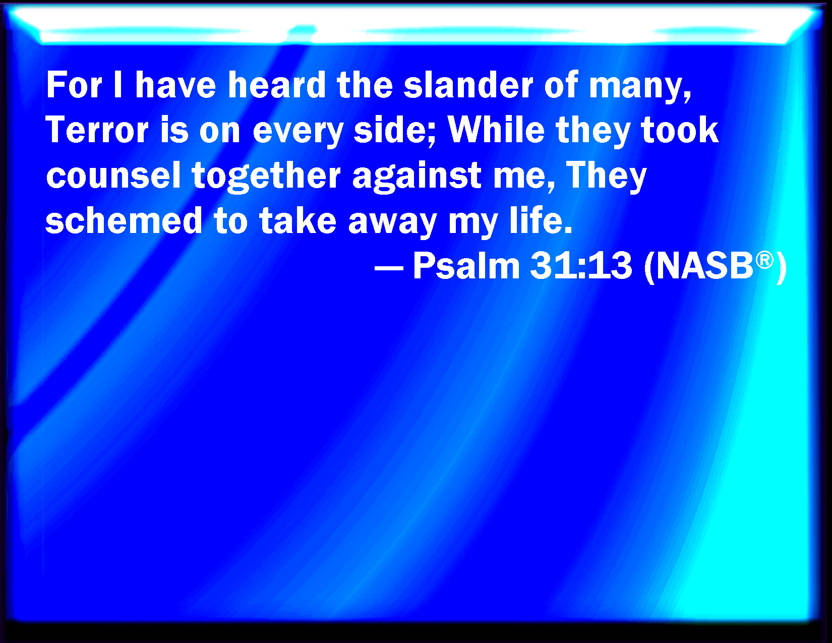 Bible Verse Slide Psalm 31:13 For I have heard the slander of many: fear was on every side: while they took counsel together against me, they devised to take away my life. KJV: For I have heard the slander of many: fear was on every side: while they took counsel together against me, they devised to take away my life. DRB: For I have heard the blame of many that dwell round about. While they assembled together against me, they consulted to take away my life. DBT: For I have heard the slander of many terror on every side when they take counsel together against me: they plot to take away my life. ERV: For I have heard the defaming of many, terror on every side: while they took counsel together against me, they devised to take away my life. WBT: For I have heard the slander of many: fear was on every side: while they took counsel together against me, they devised to take away my life. WEB: For I have heard the slander of many, terror on every side, while they conspire together against me, they plot to take away my life. YLT: For I have heard an evil account of many, Fear is round about. In their being united against me, To take my life they have devised,Links Psalm 31:13 NIV • Psalm 31:13 NLT • Psalm 31:13 ESV • Psalm 31:13 NASB • Psalm 31:13 KJV • Psalm 31:13 Interlinear • Psalm 31:13 Commentaries • Psalm 31:13 Parallel Texts • Psalm 31:13 Bible Apps • Psalm 31:13 Parallel • Bible Hub |