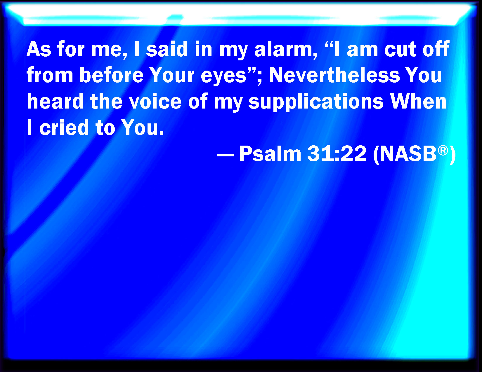 Bible Verse Slide Psalm 31:22 For I said in my haste, I am cut off from before your eyes: nevertheless you heard the voice of my supplications when I cried to you. KJV: For I said in my haste, I am cut off from before thine eyes: nevertheless thou heardest the voice of my supplications when I cried unto thee. DRB: But I said in the excess of my mind: I am cast away from before thy eyes. Therefore thou hast heard the voice of my prayer, when I cried to thee. DBT: As for me, I said in my haste, I am cut off from before thine eyes; nevertheless thou heardest the voice of my supplications when I cried unto thee. ERV: As for me, I said in my haste, I am cut off from before thine eyes: nevertheless thou heardest the voice of my supplications when I cried unto thee. WBT: For I said in my haste, I am cut off from before thy eyes: nevertheless thou heardest the voice of my supplications when I cried to thee. WEB: As for me, I said in my haste, "I am cut off from before your eyes." Nevertheless you heard the voice of my petitions when I cried to you. YLT: And I — I have said in my haste, 'I have been cut off from before Thine eyes,' But Thou hast heard the voice of my supplications, In my crying unto Thee.Links Psalm 31:22 NIV • Psalm 31:22 NLT • Psalm 31:22 ESV • Psalm 31:22 NASB • Psalm 31:22 KJV • Psalm 31:22 Interlinear • Psalm 31:22 Commentaries • Psalm 31:22 Parallel Texts • Psalm 31:22 Bible Apps • Psalm 31:22 Parallel • Bible Hub |
