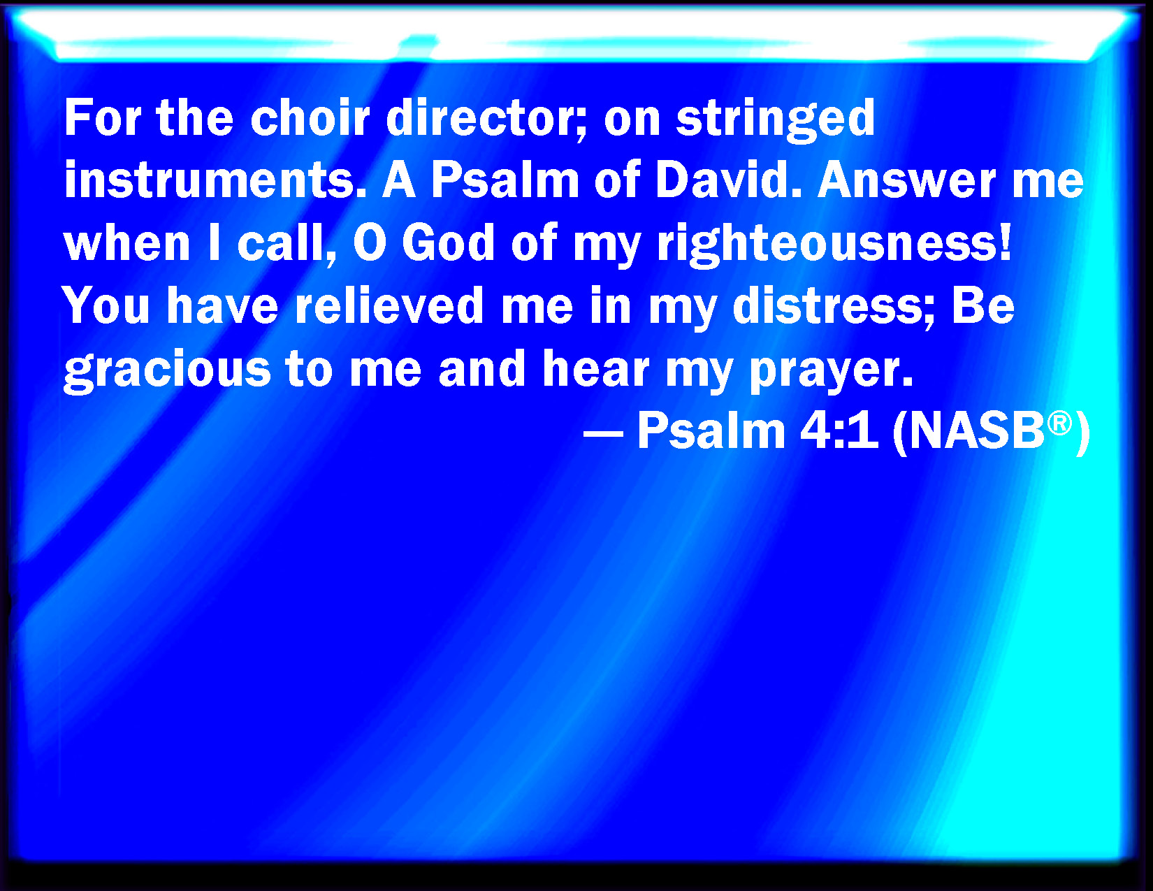Bible Verse Slide Psalm 4:1 Hear me when I call, O God of my righteousness: you have enlarged me when I was in distress; have mercy on me, and hear my prayer. KJV: {To the chief Musician on Neginoth, A Psalm of David.} Hear me when I call, O God of my righteousness: thou hast enlarged me when I was in distress; have mercy upon me, and hear my prayer. DRB: Unto the end, in verses. A psalm of David. When I called upon him, the God of my justice heard me: when I was in distress, thou hast enlarged me. Have mercy on me: and hear my prayer. DBT: {To the chief Musician. On stringed instruments. A Psalm of David.} When I call, answer me, O God of my righteousness: in pressure thou hast enlarged me; be gracious unto me, and hear my prayer. ERV: For the Chief Musician; on stringed instruments. A Psalm of David. Answer me when I call, O God of my righteousness; thou hast set me at large when I was in distress: have mercy upon me, and hear my prayer. WBT: To the chief Musician on Neginoth, A Psalm of David. Hear me when I call, O God of my righteousness: thou hast enlarged me when I was in distress; have mercy upon me, and hear my prayer. WEB: Answer me when I call, God of my righteousness. Give me relief from my distress. Have mercy on me, and hear my prayer. YLT: To the Overseer with Stringed Instruments. — A Psalm of David. In my calling answer Thou me, O God of my righteousness. In adversity Thou gavest enlargement to me; Favour me, and hear my prayer.Links Psalm 4:1 NIV • Psalm 4:1 NLT • Psalm 4:1 ESV • Psalm 4:1 NASB • Psalm 4:1 KJV • Psalm 4:1 Interlinear • Psalm 4:1 Commentaries • Psalm 4:1 Parallel Texts • Psalm 4:1 Bible Apps • Psalm 4:1 Parallel • Bible Hub |