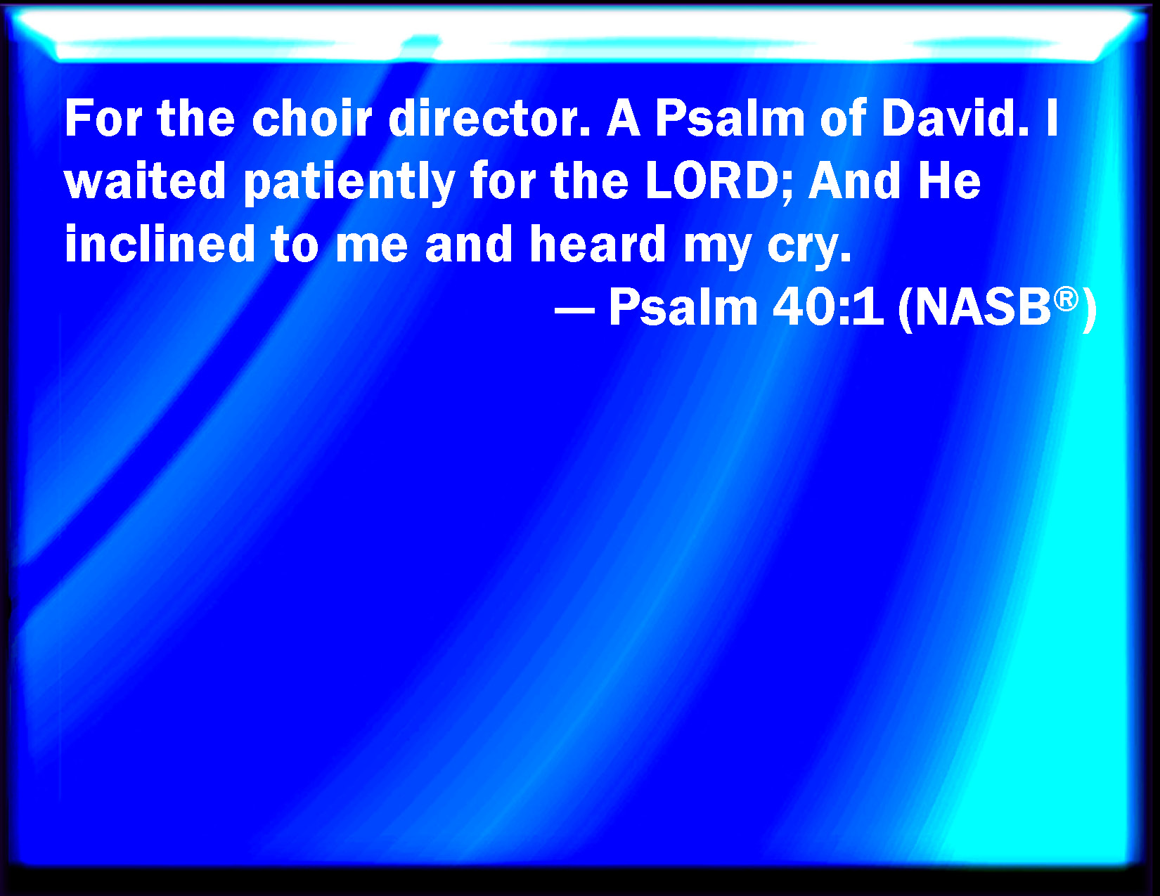 Bible Verse Slide Psalm 40:1 I waited patiently for the LORD; and he inclined to me, and heard my cry. KJV: {To the chief Musician, A Psalm of David.} I waited patiently for the LORD; and he inclined unto me, and heard my cry. DRB: Unto the end, a psalm for David himself. With expectation I have waited for the Lord, and he was attentive to me. DBT: {To the chief Musician. Of David. A Psalm.} I waited patiently for Jehovah; and he inclined unto me, and heard my cry. ERV: For the Chief Musician. A Psalm of David. I waited patiently for the LORD; and he inclined unto me, and heard my cry. WBT: To the chief Musician, A Psalm of David. I waited patiently for the LORD; and he inclined to me, and heard my cry. WEB: I waited patiently for Yahweh. He turned to me, and heard my cry. YLT: To the Overseer. — A Psalm of David. I have diligently expected Jehovah, And He inclineth to me, and heareth my cry,Links Psalm 40:1 NIV • Psalm 40:1 NLT • Psalm 40:1 ESV • Psalm 40:1 NASB • Psalm 40:1 KJV • Psalm 40:1 Interlinear • Psalm 40:1 Commentaries • Psalm 40:1 Parallel Texts • Psalm 40:1 Bible Apps • Psalm 40:1 Parallel • Bible Hub |