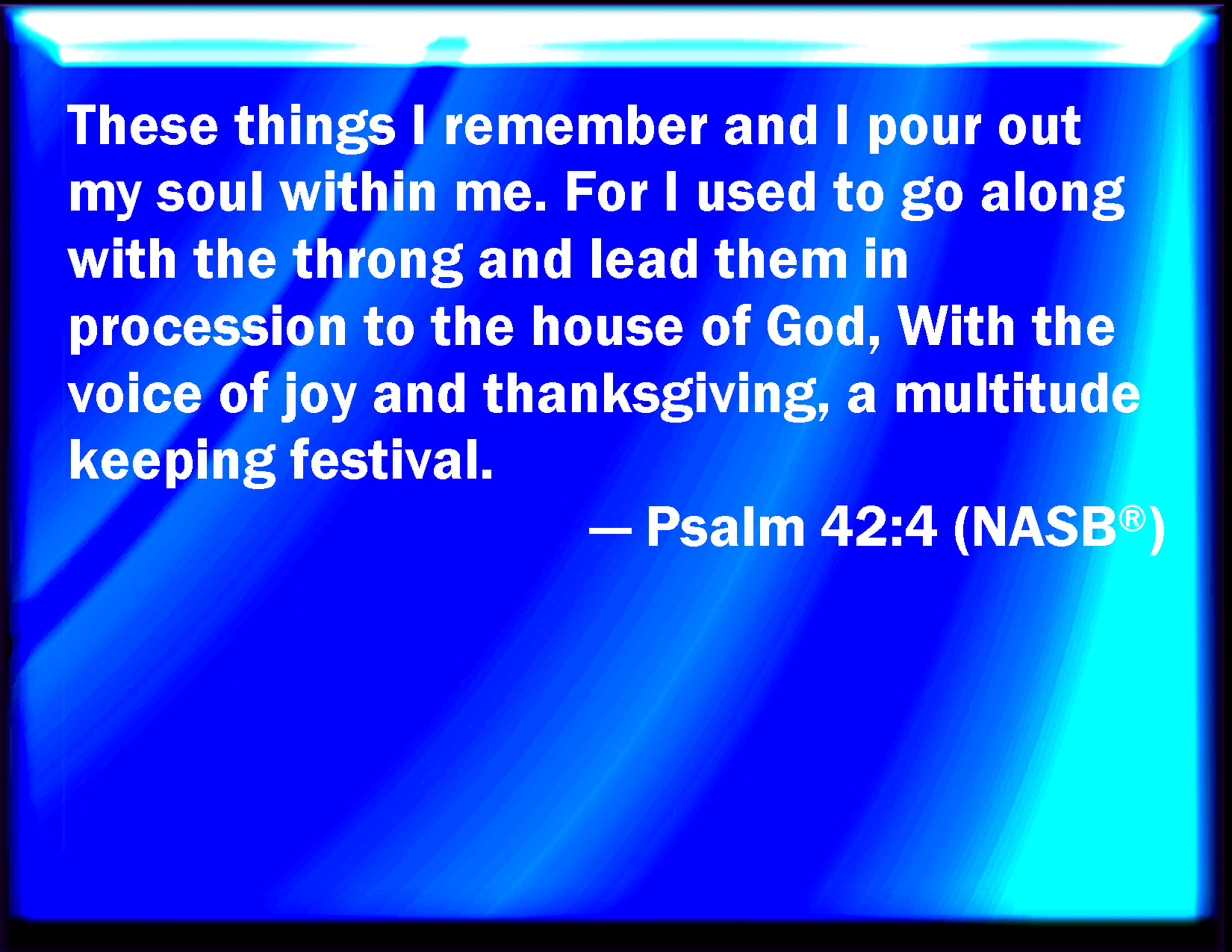 Bible Verse Slide Psalm 42:4 When I remember these things, I pour out my soul in me: for I had gone with the multitude, I went with them to the house of God, with the voice of joy and praise, with a multitude that kept holy day. KJV: When I remember these things, I pour out my soul in me: for I had gone with the multitude, I went with them to the house of God, with the voice of joy and praise, with a multitude that kept holyday. DRB: These things I remembered, and poured out my soul in me : for I shall go over into the place of the wonderful tabernacle, even to the house of God : With the voice of joy and praise; the noise of one feasting. DBT: These things I remember and have poured out my soul within me: how I passed along with the multitude, how I went on with them to the house of God, with the voice of joy and praise, a festive multitude. ERV: These things I remember, and pour out my soul within me, how I went with the throng, and led them to the house of God, with the voice of joy and praise, a multitude keeping holyday. WBT: When I remember these things, I pour out my soul in me: for I had gone with the multitude, I went with them to the house of God, with the voice of joy and praise, with a multitude that kept holy-day. WEB: These things I remember, and pour out my soul within me, how I used to go with the crowd, and led them to the house of God, with the voice of joy and praise, a multitude keeping a holy day. YLT: These I remember, and pour out my soul in me, For I pass over into the booth, I go softly with them unto the house of God, With the voice of singing and confession, The multitude keeping feast!Links Psalm 42:4 NIV • Psalm 42:4 NLT • Psalm 42:4 ESV • Psalm 42:4 NASB • Psalm 42:4 KJV • Psalm 42:4 Interlinear • Psalm 42:4 Commentaries • Psalm 42:4 Parallel Texts • Psalm 42:4 Bible Apps • Psalm 42:4 Parallel • Bible Hub |