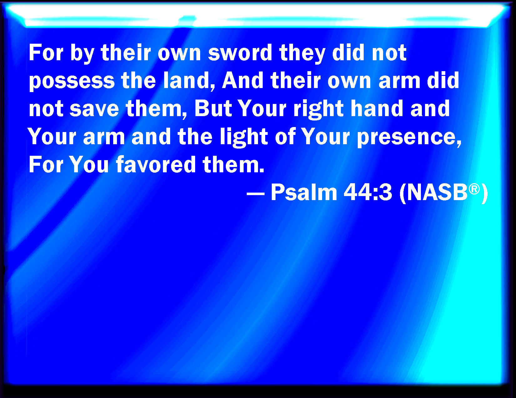 Bible Verse Slide Psalm 44:3 For they got not the land in possession by their own sword, neither did their own arm save them: but your right hand, and your arm, and the light of your countenance, because you had a favor to them. KJV: For they got not the land in possession by their own sword, neither did their own arm save them: but thy right hand, and thine arm, and the light of thy countenance, because thou hadst a favour unto them. DRB: For they got not the possession of the land by their own sword : neither did their own arm save them. But thy right hand and thy arm, and the light of thy countenance : because thou wast pleased with them. DBT: For not by their own sword did they take possession of the land, neither did their own arm save them; but thy right hand, and thine arm, and the light of thy countenance, because thou hadst delight in them. ERV: For they gat not the land in possession by their own sword, neither did their own arm save them: but thy right hand, and thine arm, and the light of thy countenance, because thou hadst a favour unto them. WBT: For they obtained not the land in possession by their own sword, neither did their own arm save them: but thy right hand, and thy arm, and the light of thy countenance, because thou hadst a favor to them. WEB: For they didn't get the land in possession by their own sword, neither did their own arm save them; but your right hand, and your arm, and the light of your face, because you were favorable to them. YLT: For, not by their sword Possessed they the land, And their arm gave not salvation to them, But Thy right hand, and Thine arm, And the light of Thy countenance, Because Thou hadst accepted them.Links Psalm 44:3 NIV • Psalm 44:3 NLT • Psalm 44:3 ESV • Psalm 44:3 NASB • Psalm 44:3 KJV • Psalm 44:3 Interlinear • Psalm 44:3 Commentaries • Psalm 44:3 Parallel Texts • Psalm 44:3 Bible Apps • Psalm 44:3 Parallel • Bible Hub |