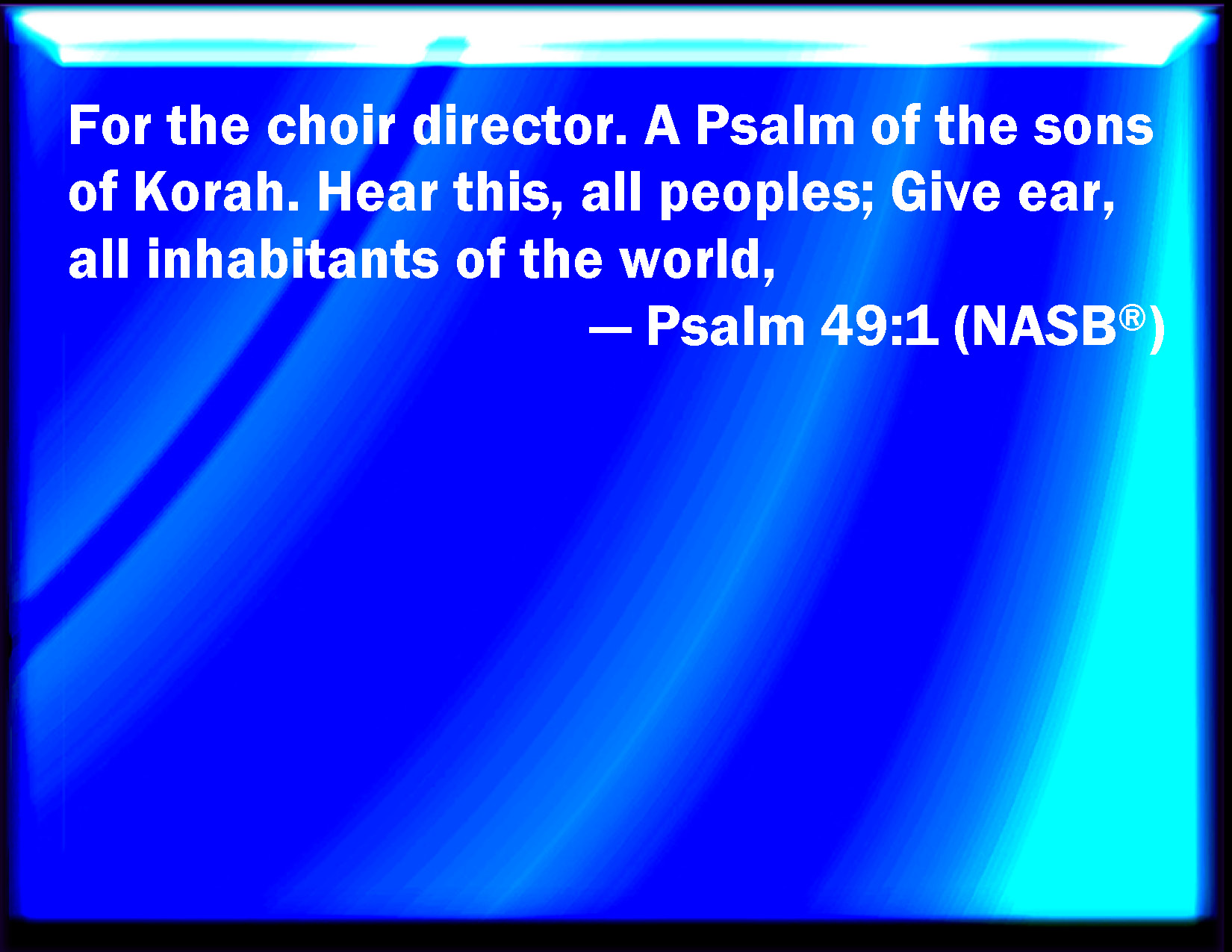 Bible Verse Slide Psalm 49:1 Hear this, all you people; give ear, all you inhabitants of the world: KJV: {To the chief Musician, A Psalm for the sons of Korah.} Hear this, all ye people; give ear, all ye inhabitants of the world: DRB: Unto the end, a psalm for the sons of Core. Hear these things, all ye nations: give ear, all ye inhabitants of the world. DBT: {To the chief Musician. Of the sons of Korah. A Psalm.} Hear this, all ye peoples; give ear, all inhabitants of the world: ERV: For the Chief Musician; a Psalm of the sons of Korah. Hear this, all ye peoples; give ear, all ye inhabitants of the world: WBT: To the chief Musician, A Psalm for the sons of Korah. Hear this, all ye people; give ear, all ye inhabitants of the world: WEB: Hear this, all you peoples. Listen, all you inhabitants of the world, YLT: To the Overseer. — By sons of Korah. A Psalm. Hear this, all ye peoples, Give ear, all ye inhabitants of the world.Links Psalm 49:1 NIV • Psalm 49:1 NLT • Psalm 49:1 ESV • Psalm 49:1 NASB • Psalm 49:1 KJV • Psalm 49:1 Interlinear • Psalm 49:1 Commentaries • Psalm 49:1 Parallel Texts • Psalm 49:1 Bible Apps • Psalm 49:1 Parallel • Bible Hub |