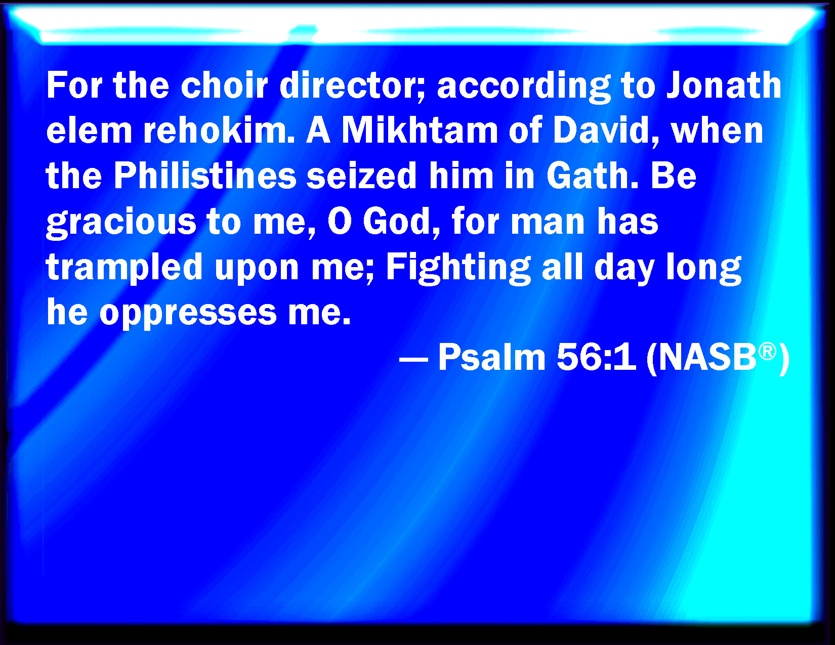Bible Verse Slide Psalm 56:1 Be merciful to me, O God: for man would swallow me up; he fighting daily oppresses me. KJV: {To the chief Musician upon Jonathelemrechokim, Michtam of David, when the Philistines took him in Gath.} Be merciful unto me, O God: for man would swallow me up; he fighting daily oppresseth me. DRB: Unto the end, for a people that is removed at a distance from the sanctuary for David, for an inscription of a title (or pillar ) when the Philistines held him in Geth. Have mercy on me, O God, for man hath trodden me under foot; all the day long he hath afflicted me fighting against me. DBT: {To the chief Musician. On Jonathelem-rechokim. Of David. Michtam; when the Philistines took him in Gath.} Be gracious unto me, O God; for man would swallow me up: all the day long fighting he oppresseth me. ERV: For the Chief Musician; set to Jonath elem rehokim. A Psalm of David: Michtam: when the Philistines took him in Gath. Be merciful unto me, O God; for man would swallow me up: all the day long he fighting oppresseth me. WBT: To the chief Musician upon Jonathelem-rechokim, Michtam of David, when the Philistines took him in Gath. Be merciful to me, O God: for man would swallow me up; he fighting daily oppresseth me. WEB: Be merciful to me, God, for man wants to swallow me up. All day long, he attacks and oppresses me. YLT: To the Overseer. — 'On the Dumb Dove far off.' — A secret treasure of David, in the Philistines' taking hold of him in Gath. Favour me, O God, for man swallowed me up, All the day fighting he oppresseth me,Links Psalm 56:1 NIV • Psalm 56:1 NLT • Psalm 56:1 ESV • Psalm 56:1 NASB • Psalm 56:1 KJV • Psalm 56:1 Interlinear • Psalm 56:1 Commentaries • Psalm 56:1 Parallel Texts • Psalm 56:1 Bible Apps • Psalm 56:1 Parallel • Bible Hub |