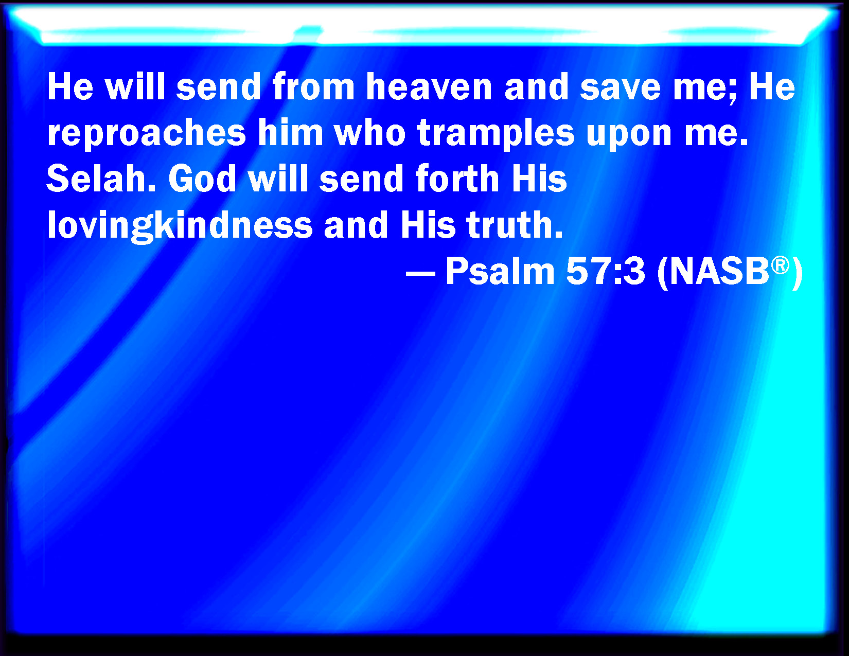 Bible Verse Slide Psalm 57:3 He shall send from heaven, and save me from the reproach of him that would swallow me up. Selah. God shall send forth his mercy and his truth. KJV: He shall send from heaven, and save me from the reproach of him that would swallow me up. Selah. God shall send forth his mercy and his truth. DRB: He hath sent from heaven and delivered me: he hath made them a reproach that trod upon me. God hath sent his mercy and his truth, DBT: He will send from the heavens and save me; he hath covered with reproach him that would swallow me up. Selah. God hath sent forth his loving-kindness and his truth. ERV: He shall send from heaven, and save me, when he that would swallow me up reproacheth; Selah God shall send forth his mercy and his truth. WBT: He shall send from heaven, and save me from the reproach of him that would swallow me up. Selah. God shall send forth his mercy and his truth. WEB: He will send from heaven, and save me, he rebukes the one who is pursuing me. Selah. God will send out his loving kindness and his truth. YLT: He sendeth from the heaven, and saveth me, He reproached — who is panting after me. Selah. God sendeth forth His kindness and His truth.Links Psalm 57:3 NIV • Psalm 57:3 NLT • Psalm 57:3 ESV • Psalm 57:3 NASB • Psalm 57:3 KJV • Psalm 57:3 Interlinear • Psalm 57:3 Commentaries • Psalm 57:3 Parallel Texts • Psalm 57:3 Bible Apps • Psalm 57:3 Parallel • Bible Hub |