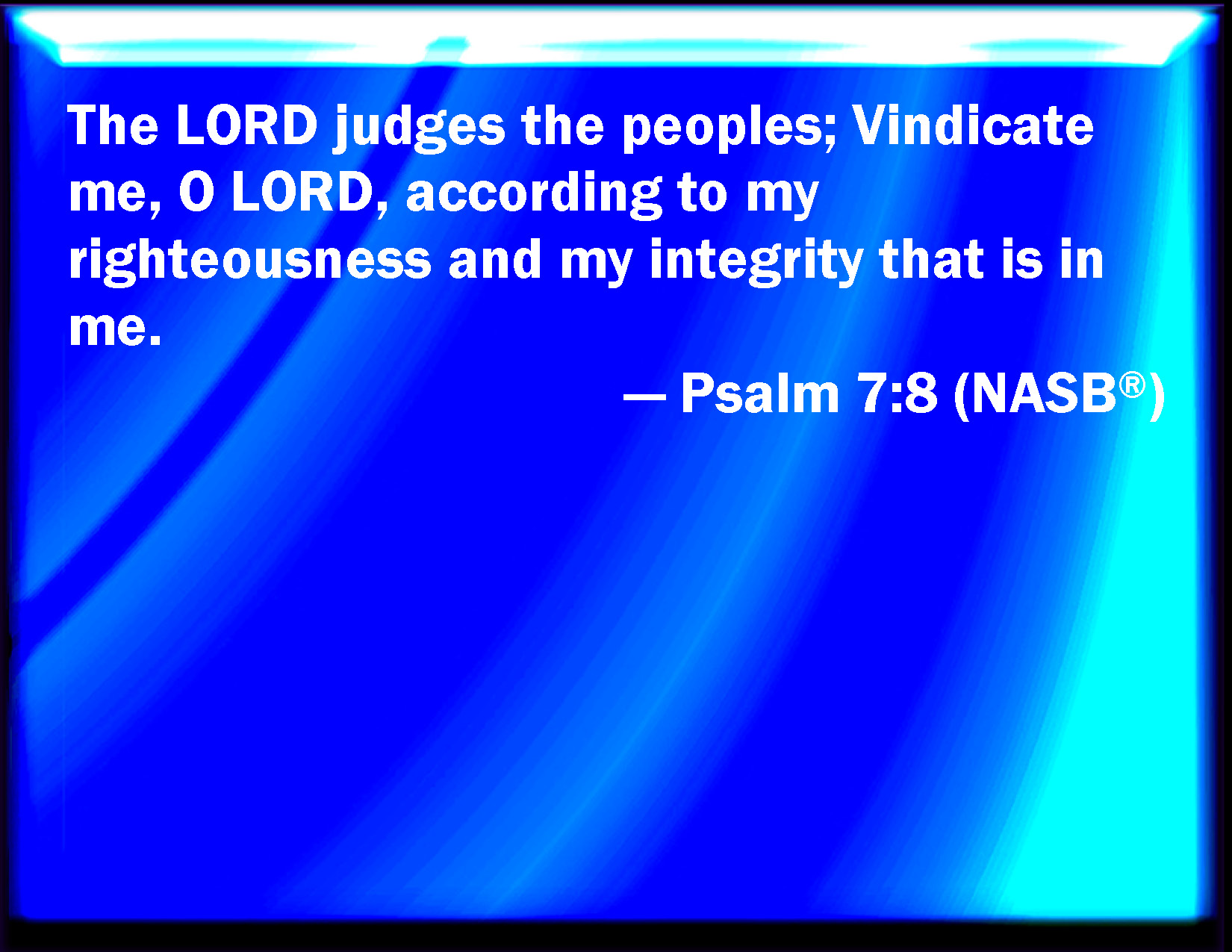 Bible Verse Slide Psalm 7:8 The LORD shall judge the people: judge me, O LORD, according to my righteousness, and according to my integrity that is in me. KJV: The LORD shall judge the people: judge me, O LORD, according to my righteousness, and according to mine integrity that is in me. DRB: The Lord judgeth the people. Judge me, O Lord, according to my justice, and according to my innocence in me. DBT: Jehovah shall minister judgment to the peoples. Judge me, Jehovah, according to my righteousness, and according to mine integrity which is in me. ERV: The LORD ministereth judgment to the peoples: judge me, O LORD, according to my righteousness, and to mine integrity that is in me. WBT: The LORD shall judge the people: judge me, O LORD, according to my righteousness, and according to my integrity that is in me. WEB: Yahweh administers judgment to the peoples. Judge me, Yahweh, according to my righteousness, and to my integrity that is in me. YLT: Jehovah doth judge the peoples; Judge me, O Jehovah, According to my righteousness, And according to mine integrity on me,Links Psalm 7:8 NIV • Psalm 7:8 NLT • Psalm 7:8 ESV • Psalm 7:8 NASB • Psalm 7:8 KJV • Psalm 7:8 Interlinear • Psalm 7:8 Commentaries • Psalm 7:8 Parallel Texts • Psalm 7:8 Bible Apps • Psalm 7:8 Parallel • Bible Hub |