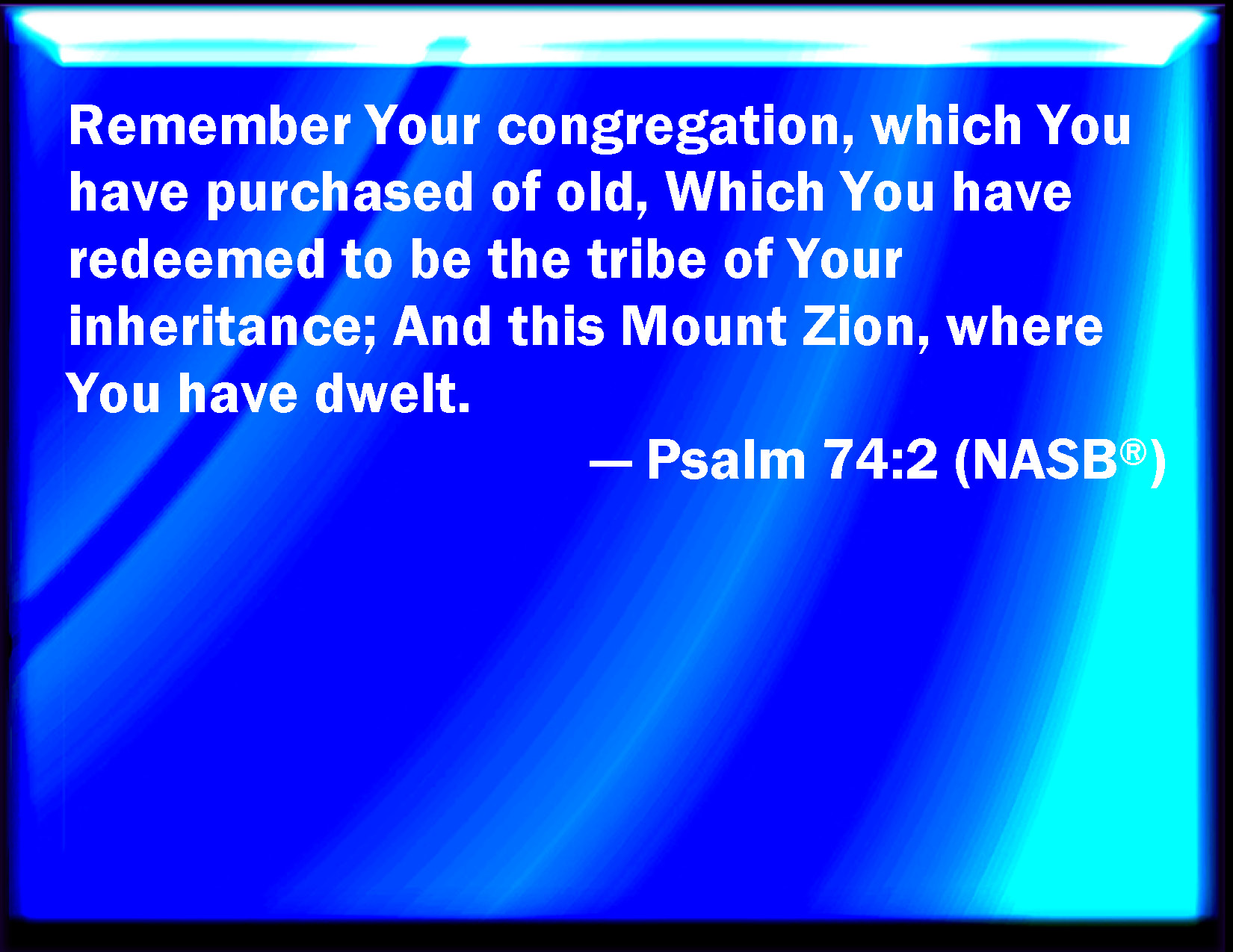 Bible Verse Slide Psalm 74:2 Remember your congregation, which you have purchased of old; the rod of your inheritance, which you have redeemed; this mount Zion, wherein you have dwelled. KJV: Remember thy congregation, which thou hast purchased of old; the rod of thine inheritance, which thou hast redeemed; this mount Zion, wherein thou hast dwelt. DRB: Remember thy congregation, which thou hast possessed from the beginning. The sceptre of thy inheritance which thou hast redeemed: mount Sion in which thou hast dwelt. DBT: Remember thine assembly, which thou hast purchased of old, which thou hast redeemed to be the portion of thine inheritance, this mount Zion, wherein thou hast dwelt. ERV: Remember thy congregation, which thou hast purchased of old, which thou hast redeemed to be the tribe of thine inheritance; and mount Zion, wherein thou hast dwelt. WBT: Remember thy congregation, which thou hast purchased of old: the rod of thy inheritance, which thou hast redeemed; this mount Zion, in which thou hast dwelt. WEB: Remember your congregation, which you purchased of old, which you have redeemed to be the tribe of your inheritance; Mount Zion, in which you have lived. YLT: Remember Thy company. Thou didst purchase of old, Thou didst redeem the rod of Thy inheritance, This mount Zion — Thou didst dwell in it.Links Psalm 74:2 NIV • Psalm 74:2 NLT • Psalm 74:2 ESV • Psalm 74:2 NASB • Psalm 74:2 KJV • Psalm 74:2 Interlinear • Psalm 74:2 Commentaries • Psalm 74:2 Parallel Texts • Psalm 74:2 Bible Apps • Psalm 74:2 Parallel • Bible Hub |