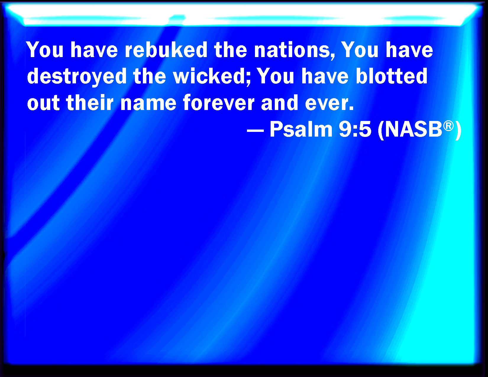 Bible Verse Slide Psalm 9:5 You have rebuked the heathen, you have destroyed the wicked, you have put out their name for ever and ever. KJV: Thou hast rebuked the heathen, thou hast destroyed the wicked, thou hast put out their name for ever and ever. DRB: Thou hast rebuked the Gentiles, and the wicked one hath perished: thou hast blotted out their name for ever and ever. DBT: Thou hast rebuked the nations, thou hast destroyed the wicked; thou hast put out their name for ever and ever. ERV: Thou hast rebuked the nations, thou hast destroyed the wicked, thou hast blotted out their name for ever and ever. WBT: Thou hast rebuked the heathen, thou hast destroyed the wicked, thou hast put out their name for ever and ever. WEB: You have rebuked the nations. You have destroyed the wicked. You have blotted out their name forever and ever. YLT: Thou hast rebuked nations, Thou hast destroyed the wicked, Their name Thou hast blotted out to the age and for ever.Links Psalm 9:5 NIV • Psalm 9:5 NLT • Psalm 9:5 ESV • Psalm 9:5 NASB • Psalm 9:5 KJV • Psalm 9:5 Interlinear • Psalm 9:5 Commentaries • Psalm 9:5 Parallel Texts • Psalm 9:5 Bible Apps • Psalm 9:5 Parallel • Bible Hub |