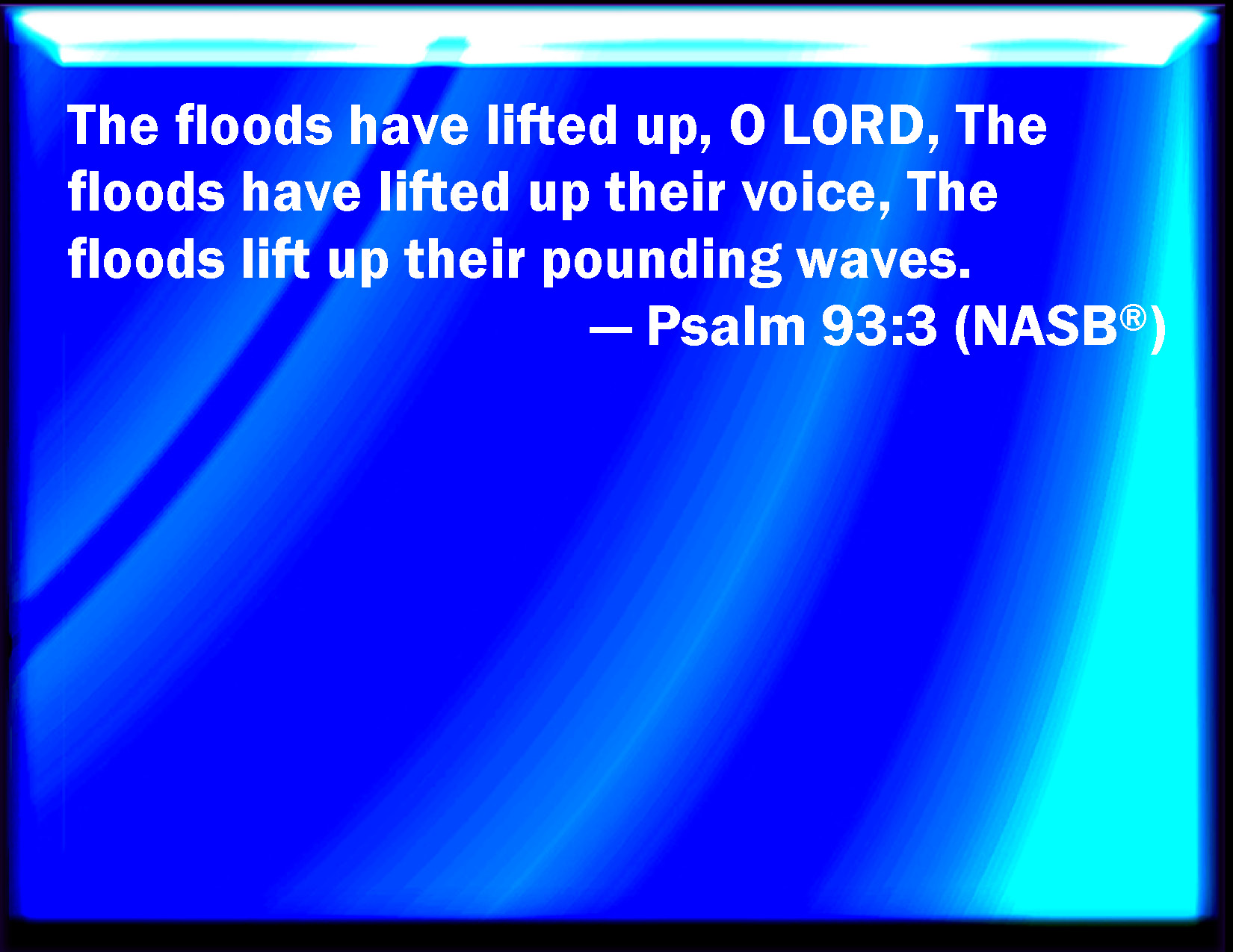 Bible Verse Slide Psalm 93:3 The floods have lifted up, O LORD, the floods have lifted up their voice; the floods lift up their waves. KJV: The floods have lifted up, O LORD, the floods have lifted up their voice; the floods lift up their waves. DRB: The floods have lifted up, O Lord: the floods have lifted up their voice. The floods have lifted up their waves, DBT: The floods lifted up, O Jehovah, the floods lifted up their voice; the floods lifted up their roaring waves. ERV: The floods have lifted up, O LORD, the floods have lifted up their voice; the floods lift up their waves. WBT: The floods have lifted up, O LORD, the floods have lifted up their voice; the floods lift their waves. WEB: The floods have lifted up, Yahweh, the floods have lifted up their voice. The floods lift up their waves. YLT: Floods have lifted up, O Jehovah, Floods have lifted up their voice, Floods lift up their breakers.Links Psalm 93:3 NIV • Psalm 93:3 NLT • Psalm 93:3 ESV • Psalm 93:3 NASB • Psalm 93:3 KJV • Psalm 93:3 Interlinear • Psalm 93:3 Commentaries • Psalm 93:3 Parallel Texts • Psalm 93:3 Bible Apps • Psalm 93:3 Parallel • Bible Hub |