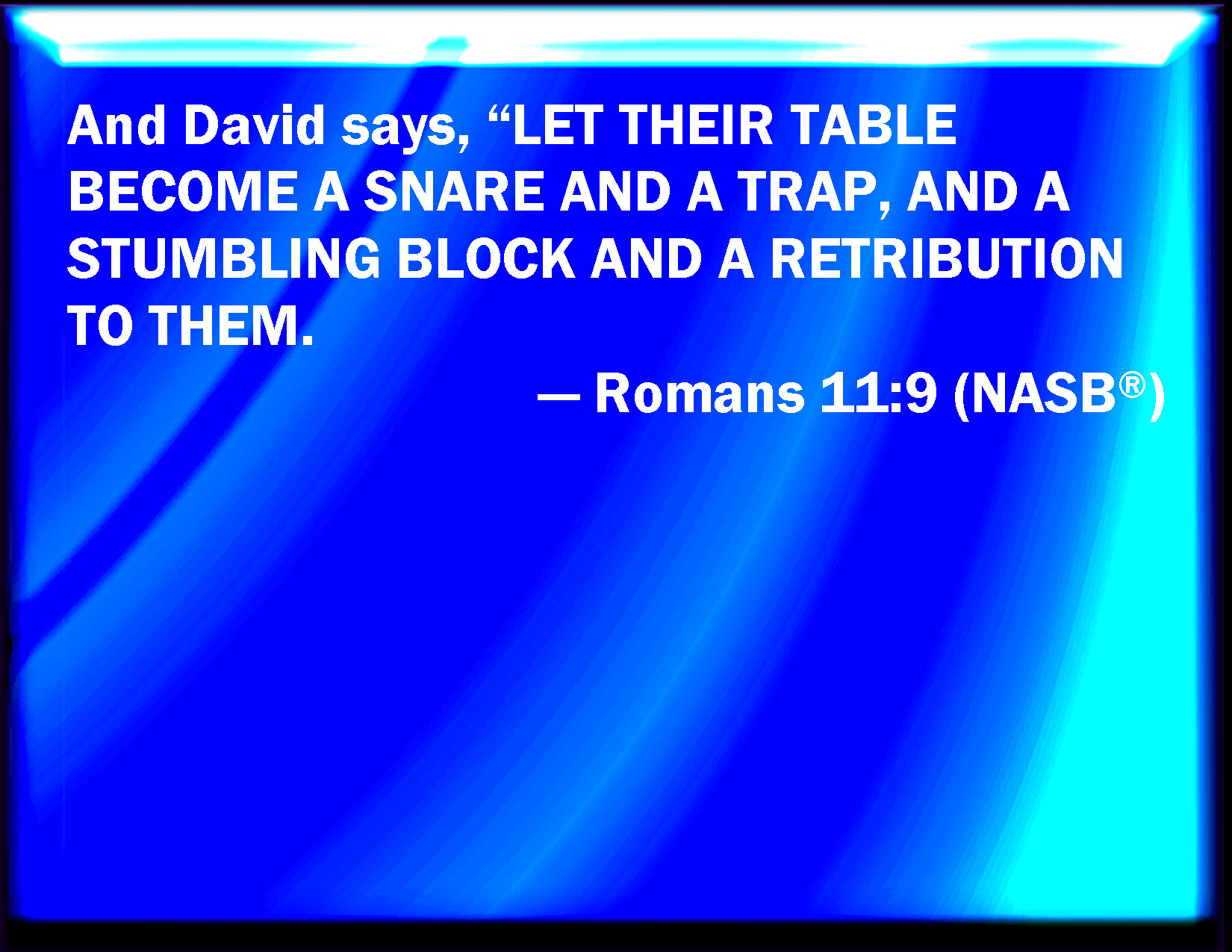 Bible Verse Slide Romans 11:9 And David said, Let their table be made a snare, and a trap, and a stumbling block, and a recompense to them: KJV: And David saith, Let their table be made a snare, and a trap, and a stumblingblock, and a recompence unto them: DRB: And David saith: Let their table be made a snare, and a trap, and a stumblingblock, and a recompense unto them. DBT: And David says, Let their table be for a snare, and for a gin, and for a fall-trap, and for a recompense to them: ERV: And David saith, Let their table be made a snare, and a trap, And a stumblingblock, and a recompense unto them: WBT: And David saith, Let their table be made a snare, and a trap, and a stumbling-block, and a recompense to them: WEB: David says, "Let their table be made a snare, and a trap, a stumbling block, and a retribution to them. YLT: and David saith, 'Let their table become for a snare, and for a trap, and for a stumbling-block, and for a recompense to them;Links Romans 11:9 NIV • Romans 11:9 NLT • Romans 11:9 ESV • Romans 11:9 NASB • Romans 11:9 KJV • Romans 11:9 Interlinear • Romans 11:9 Commentaries • Romans 11:9 Parallel Texts • Romans 11:9 Bible Apps • Romans 11:9 Parallel • Bible Hub |