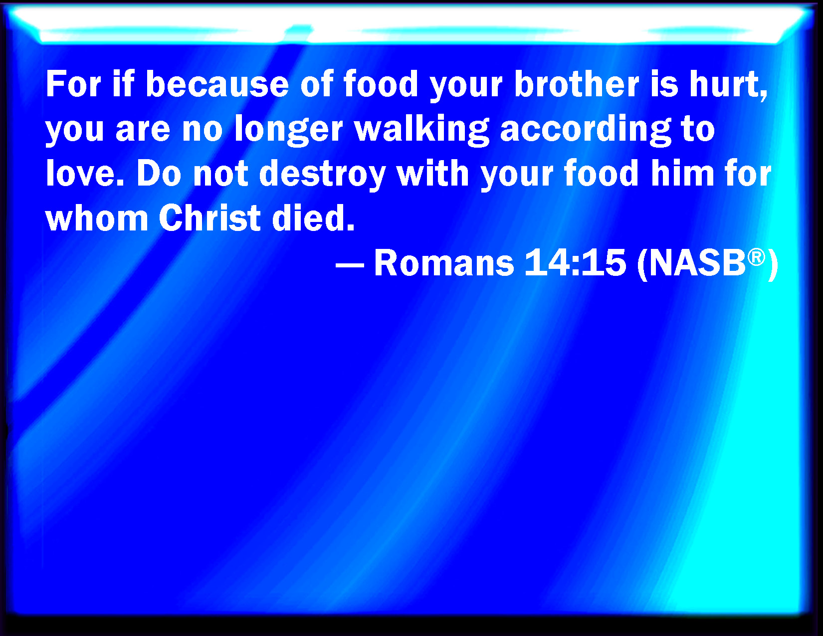 Bible Verse Slide Romans 14:15 But if your brother be grieved with your meat, now walk you not charitably. Destroy not him with your meat, for whom Christ died. KJV: But if thy brother be grieved with thy meat, now walkest thou not charitably. Destroy not him with thy meat, for whom Christ died. DRB: For if, because of thy meat, thy brother be grieved, thou walkest not now according to charity. Destroy not him with thy meat, for whom Christ died. DBT: For if on account of meat thy brother is grieved, thou walkest no longer according to love. Destroy not him with thy meat for whom Christ has died. ERV: For if because of meat thy brother is grieved, thou walkest no longer in love. Destroy not with thy meat him for whom Christ died. WBT: But if thy brother is grieved with thy food, now walkest thou not charitably. Destroy not him with thy food, for whom Christ died. WEB: Yet if because of food your brother is grieved, you walk no longer in love. Don't destroy with your food him for whom Christ died. YLT: and if through victuals thy brother is grieved, no more dost thou walk according to love; do not with thy victuals destroy that one for whom Christ died.Links Romans 14:15 NIV • Romans 14:15 NLT • Romans 14:15 ESV • Romans 14:15 NASB • Romans 14:15 KJV • Romans 14:15 Interlinear • Romans 14:15 Commentaries • Romans 14:15 Parallel Texts • Romans 14:15 Bible Apps • Romans 14:15 Parallel • Bible Hub |