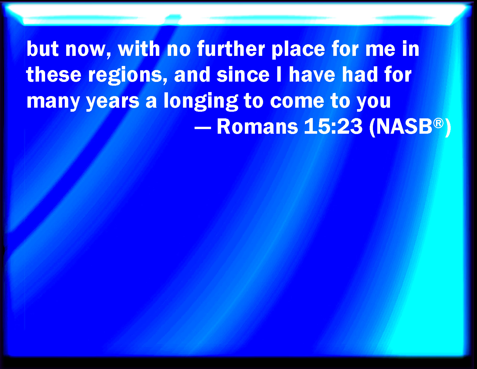Bible Verse Slide Romans 15:23 But now having no more place in these parts, and having a great desire these many years to come to you; KJV: But now having no more place in these parts, and having a great desire these many years to come unto you; DRB: But now having no more place in these countries, and having a great desire these many years past to come unto you, DBT: But now, having no longer place in these regions, and having great desire to come to you these many years, ERV: but now, having no more any place in these regions, and having these many years a longing to come unto you, WBT: But now having no more place in these parts, and having a great desire these many years to come to you; WEB: but now, no longer having any place in these regions, and having these many years a longing to come to you, YLT: and now, no longer having place in these parts, and having a longing to come unto you for many years,Links Romans 15:23 NIV • Romans 15:23 NLT • Romans 15:23 ESV • Romans 15:23 NASB • Romans 15:23 KJV • Romans 15:23 Interlinear • Romans 15:23 Commentaries • Romans 15:23 Parallel Texts • Romans 15:23 Bible Apps • Romans 15:23 Parallel • Bible Hub |