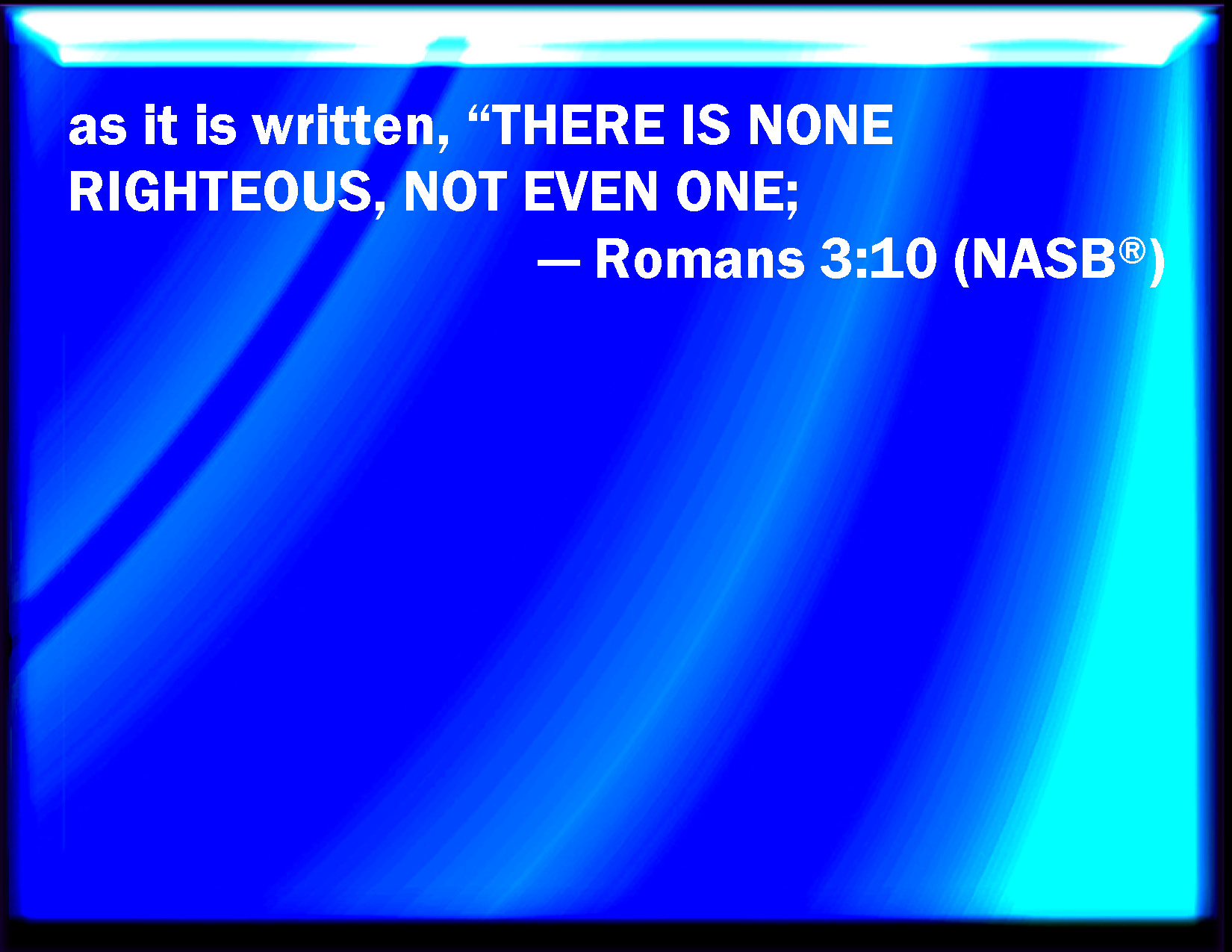 Bible Verse Slide Romans 3:10 As it is written, There is none righteous, no, not one: KJV: As it is written, There is none righteous, no, not one: DRB: As it is written: There is not any man just. DBT: according as it is written, There is not a righteous man, not even one; ERV: as it is written, There is none righteous, no, not one; WBT: As it is written, There is none righteous, no, not one: WEB: As it is written, "There is no one righteous; no, not one. YLT: according as it hath been written — 'There is none righteous, not even one;Links Romans 3:10 NIV • Romans 3:10 NLT • Romans 3:10 ESV • Romans 3:10 NASB • Romans 3:10 KJV • Romans 3:10 Interlinear • Romans 3:10 Commentaries • Romans 3:10 Parallel Texts • Romans 3:10 Bible Apps • Romans 3:10 Parallel • Bible Hub |