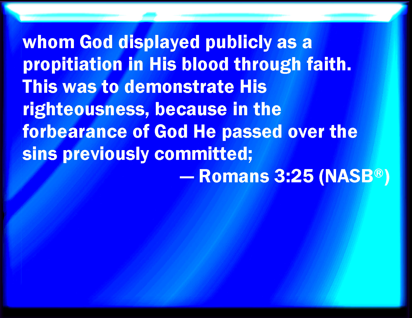 Bible Verse Slide Romans 3:25 Whom God has set forth to be a propitiation through faith in his blood, to declare his righteousness for the remission of sins that are past, through the forbearance of God; KJV: Whom God hath set forth to be a propitiation through faith in his blood, to declare his righteousness for the remission of sins that are past, through the forbearance of God; DRB: Whom God hath proposed to be a propitiation, through faith in his blood, to the shewing of his justice, for the remission of former sins, DBT: whom God has set forth a mercy-seat, through faith in his blood, for the shewing forth of his righteousness, in respect of the passing by the sins that had taken place before, through the forbearance of God; ERV: whom God set forth to be a propitiation, through faith, by his blood, to shew his righteousness, because of the passing over of the sins done aforetime, in the forbearance of God; WBT: Whom God hath set forth to be a propitiation, through faith in his blood, to declare his righteousness for the remission of sins that are past, through the forbearance of God; WEB: whom God set forth to be an atoning sacrifice, through faith in his blood, for a demonstration of his righteousness through the passing over of prior sins, in God's forbearance; YLT: whom God did set forth a mercy seat, through the faith in his blood, for the shewing forth of His righteousness, because of the passing over of the bygone sins in the forbearance of God — Links Romans 3:25 NIV • Romans 3:25 NLT • Romans 3:25 ESV • Romans 3:25 NASB • Romans 3:25 KJV • Romans 3:25 Interlinear • Romans 3:25 Commentaries • Romans 3:25 Parallel Texts • Romans 3:25 Bible Apps • Romans 3:25 Parallel • Bible Hub |
