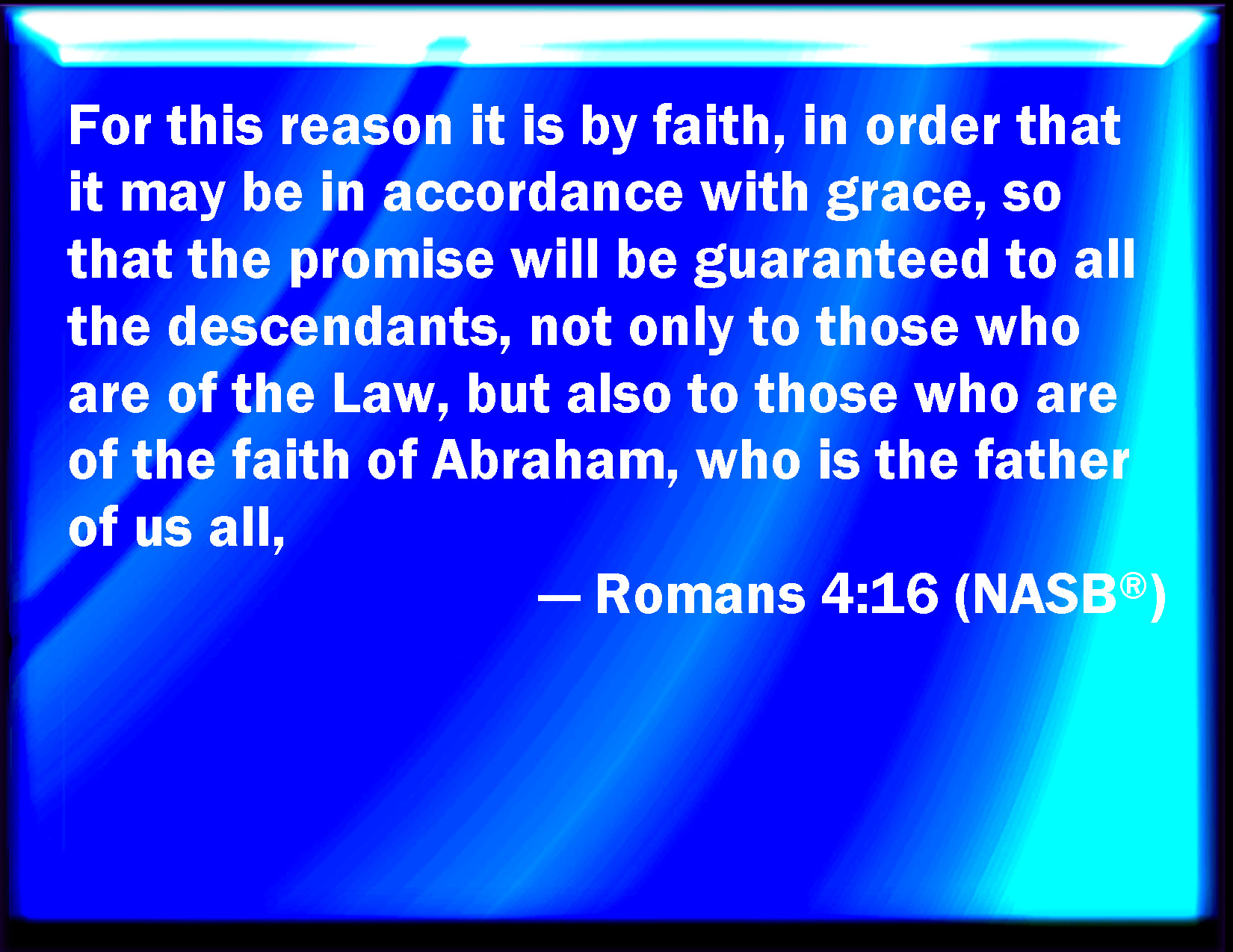 Bible Verse Slide Romans 4:16 Therefore it is of faith, that it might be by grace; to the end the promise might be sure to all the seed; not to that only which is of the law, but to that also which is of the faith of Abraham; who is the father of us all, KJV: Therefore it is of faith, that it might be by grace; to the end the promise might be sure to all the seed; not to that only which is of the law, but to that also which is of the faith of Abraham; who is the father of us all, DRB: Therefore is it of faith, that according to grace the promise might be firm to all the seed; not to that only which is of the law, but to that also which is of the faith of Abraham, who is the father of us all, DBT: Therefore it is on the principle of faith, that it might be according to grace, in order to the promise being sure to all the seed, not to that only which is of the law, but to that also which is of Abraham's faith, who is father of us all, ERV: For this cause it is of faith, that it may be according to grace; to the end that the promise may be sure to all the seed; not to that only which is of the law, but to that also which is of the faith of Abraham, who is the father of us all WBT: Therefore it is of faith, that it might be by grace; to the end the promise might be sure to all the seed, not to that only which is of the law, but to that also which is of the faith of Abraham, who is the father of us all; WEB: For this cause it is of faith, that it may be according to grace, to the end that the promise may be sure to all the seed, not to that only which is of the law, but to that also which is of the faith of Abraham, who is the father of us all. YLT: Because of this it is of faith, that it may be according to grace, for the promise being sure to all the seed, not to that which is of the law only, but also to that which is of the faith of Abraham,Links Romans 4:16 NIV • Romans 4:16 NLT • Romans 4:16 ESV • Romans 4:16 NASB • Romans 4:16 KJV • Romans 4:16 Interlinear • Romans 4:16 Commentaries • Romans 4:16 Parallel Texts • Romans 4:16 Bible Apps • Romans 4:16 Parallel • Bible Hub |