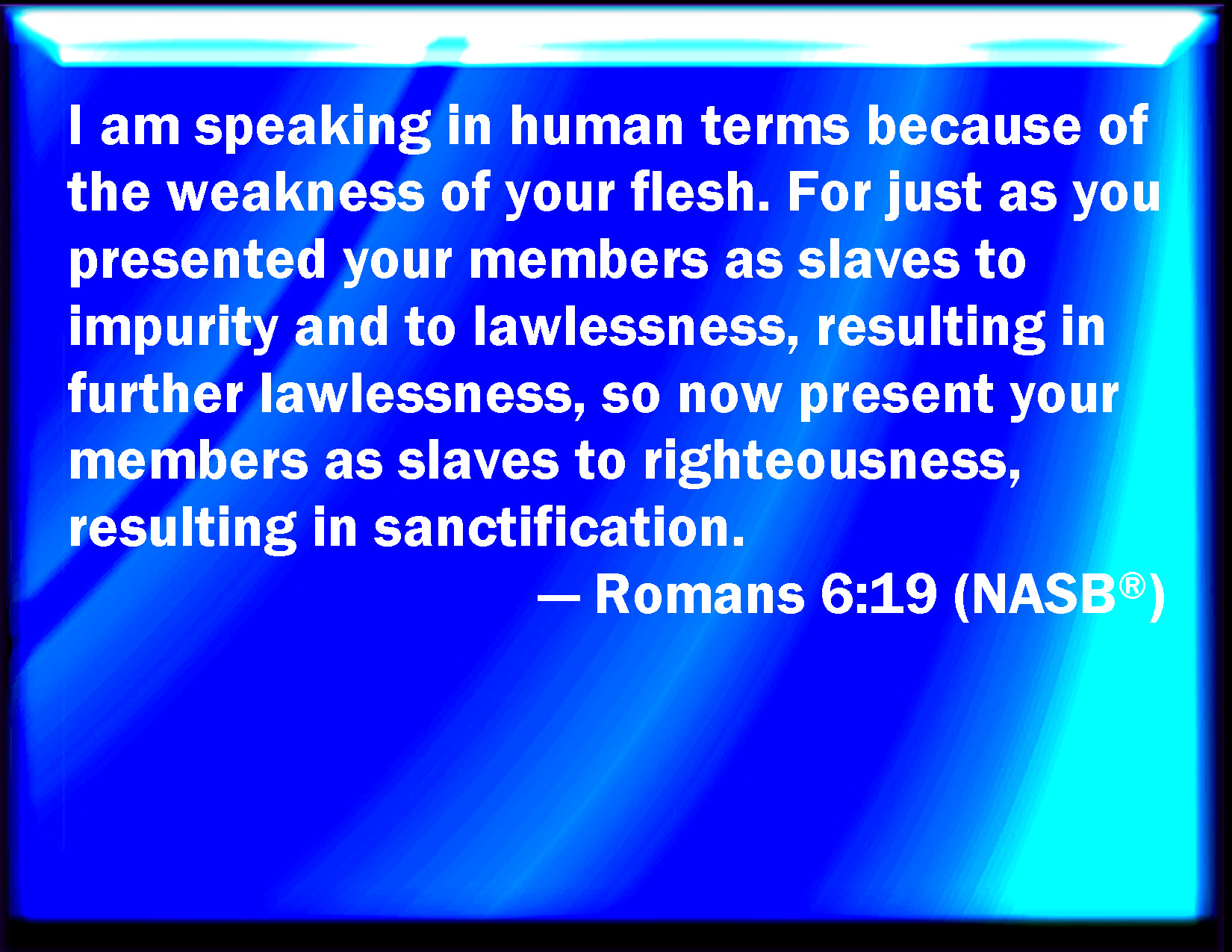 I speak humanly on account of the weakness of your flesh. For even as ye have yielded your members in bondage to uncleanness and to lawlessness unto lawlessness, so now yield your members in bondage to righteousness unto holiness.
