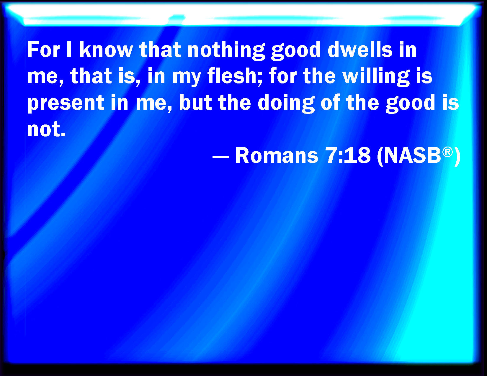 Bible Verse Slide Romans 7:18 For I know that in me (that is, in my flesh,) dwells no good thing: for to will is present with me; but how to perform that which is good I find not. KJV: For I know that in me (that is, in my flesh,) dwelleth no good thing: for to will is present with me; but how to perform that which is good I find not. DRB: For I know that there dwelleth not in me, that is to say, in my flesh, that which is good. For to will, is present with me; but to accomplish that which is good, I find not. DBT: For I know that in me, that is, in my flesh, good does not dwell: for to will is there with me, but to do right I find not. ERV: For I know that in me, that is, in my flesh, dwelleth no good thing: for to will is present with me, but to do that which is good is not. WBT: For I know that in me (that is, in my flesh,) dwelleth no good thing: for to will is present with me; but how to perform that which is good, I find not. WEB: For I know that in me, that is, in my flesh, dwells no good thing. For desire is present with me, but I don't find it doing that which is good. YLT: for I have known that there doth not dwell in me, that is, in my flesh, good: for to will is present with me, and to work that which is right I do not find,Links Romans 7:18 NIV • Romans 7:18 NLT • Romans 7:18 ESV • Romans 7:18 NASB • Romans 7:18 KJV • Romans 7:18 Interlinear • Romans 7:18 Commentaries • Romans 7:18 Parallel Texts • Romans 7:18 Bible Apps • Romans 7:18 Parallel • Bible Hub |