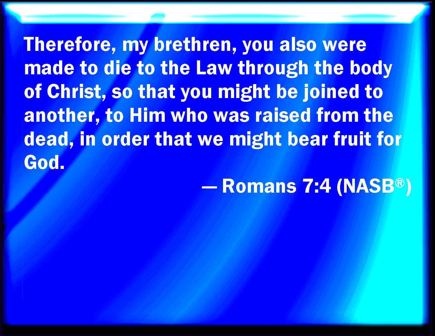Bible Verse Slide Romans 7:4 Why, my brothers, you also are become dead to the law by the body of Christ; that you should be married to another, even to him who is raised from the dead, that we should bring forth fruit to God. KJV: Wherefore, my brethren, ye also are become dead to the law by the body of Christ; that ye should be married to another, even to him who is raised from the dead, that we should bring forth fruit unto God. DRB: Therefore, my brethren, you also are become dead to the law, by the body of Christ; that you may belong to another, who is risen again from the dead, that we may bring forth fruit to God. DBT: So that, my brethren, ye also have been made dead to the law by the body of the Christ, to be to another, who has been raised up from among the dead, in order that we might bear fruit to God. ERV: Wherefore, my brethren, ye also were made dead to the law through the body of Christ; that ye should be joined to another, even to him who was raised from the dead, that we might bring forth fruit unto God. WBT: Wherefore, my brethren, ye also are become dead to the law by the body of Christ; that ye should be married to another, even to him who is raised from the dead, that we should bring forth fruit to God. WEB: Therefore, my brothers, you also were made dead to the law through the body of Christ, that you would be joined to another, to him who was raised from the dead, that we might bring forth fruit to God. YLT: So that, my brethren, ye also were made dead to the law through the body of the Christ, for your becoming another's, who out of the dead was raised up, that we might bear fruit to God;Links Romans 7:4 NIV • Romans 7:4 NLT • Romans 7:4 ESV • Romans 7:4 NASB • Romans 7:4 KJV • Romans 7:4 Interlinear • Romans 7:4 Commentaries • Romans 7:4 Parallel Texts • Romans 7:4 Bible Apps • Romans 7:4 Parallel • Bible Hub |