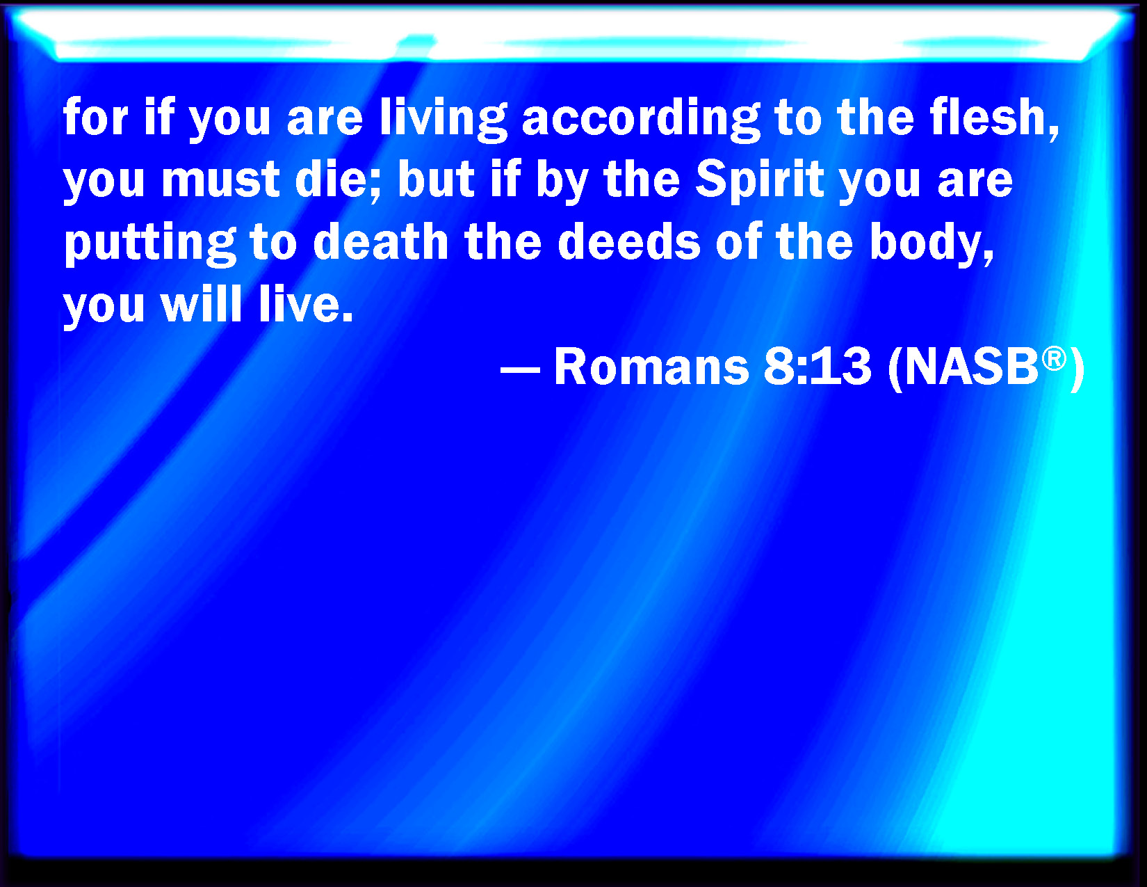 Bible Verse Slide Romans 8:13 For if you live after the flesh, you shall die: but if you through the Spirit do mortify the deeds of the body, you shall live. KJV: For if ye live after the flesh, ye shall die: but if ye through the Spirit do mortify the deeds of the body, ye shall live. DRB: For if you live according to the flesh, you shall die: but if by the Spirit you mortify the deeds of the flesh, you shall live. DBT: for if ye live according to flesh, ye are about to die; but if, by the Spirit, ye put to death the deeds of the body, ye shall live: ERV: for if ye live after the flesh, ye must die; but if by the spirit ye mortify the deeds of the body, ye shall live. WBT: For if ye live according to the flesh, ye shall die: but if ye through the Spirit mortify the deeds of the body, ye shall live. WEB: For if you live after the flesh, you must die; but if by the Spirit you put to death the deeds of the body, you will live. YLT: for if according to the flesh ye do live, ye are about to die; and if, by the Spirit, the deeds of the body ye put to death, ye shall live;Links Romans 8:13 NIV • Romans 8:13 NLT • Romans 8:13 ESV • Romans 8:13 NASB • Romans 8:13 KJV • Romans 8:13 Interlinear • Romans 8:13 Commentaries • Romans 8:13 Parallel Texts • Romans 8:13 Bible Apps • Romans 8:13 Parallel • Bible Hub |