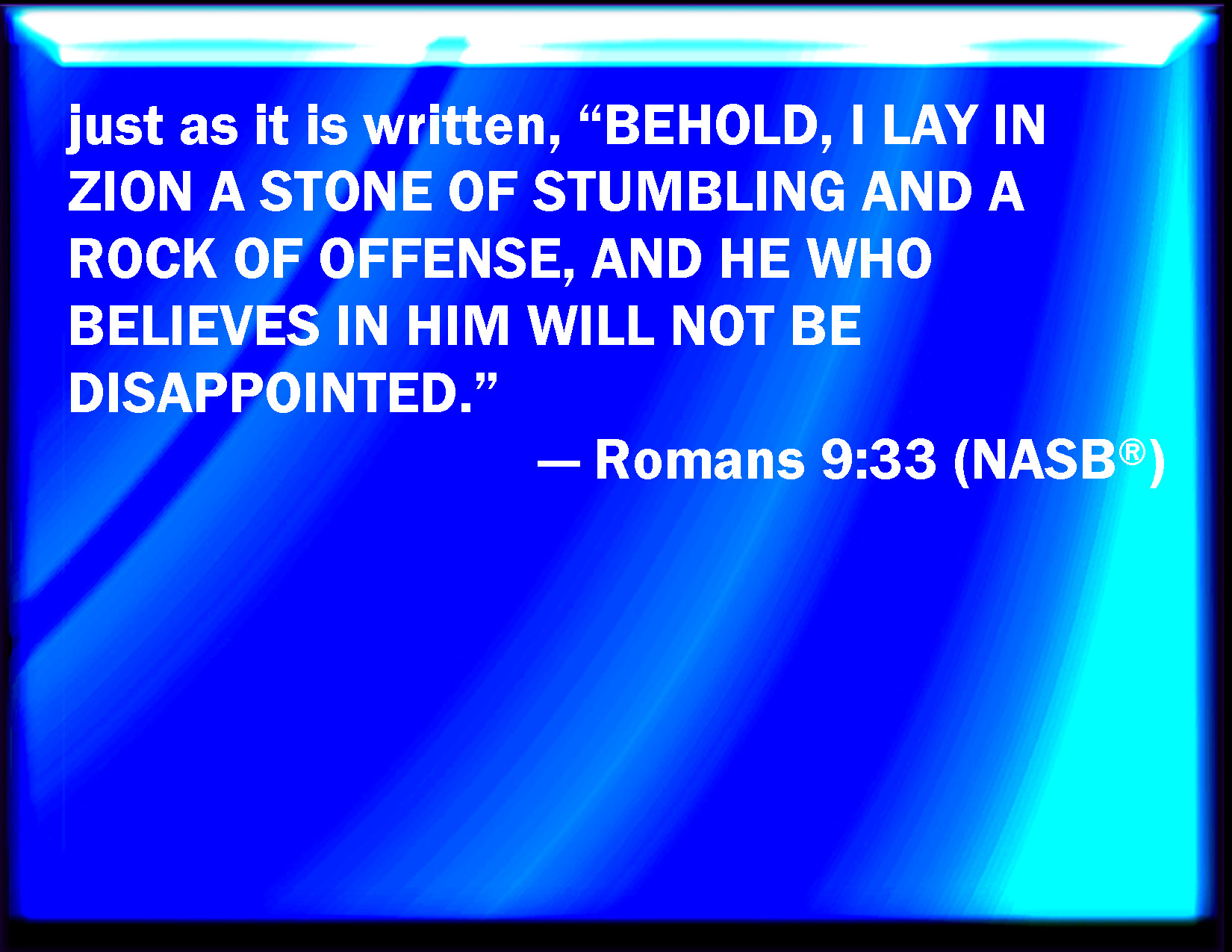 Bible Verse Slide Romans 9:33 As it is written, Behold, I lay in Sion a stumbling stone and rock of offense: and whoever believes on him shall not be ashamed. KJV: As it is written, Behold, I lay in Sion a stumblingstone and rock of offence: and whosoever believeth on him shall not be ashamed. DRB: As it is written: Behold I lay in Sion a stumblingstone and a rock of scandal; and whosoever believeth in him shall not be confounded. DBT: according as it is written, Behold, I place in Zion a stone of stumbling and rock of offence: and he that believes on him shall not be ashamed. ERV: even as it is written, Behold, I lay in Zion a stone of stumbling and a rock of offence: And he that believeth on him shall not be put to shame. WBT: As it is written, Behold, I lay in Sion a stumbling-stone, and rock of offense: and whoever believeth on him shall not be ashamed. WEB: even as it is written, "Behold, I lay in Zion a stumbling stone and a rock of offense; and no one who believes in him will be disappointed." YLT: according as it hath been written, 'Lo, I place in Sion a stone of stumbling and a rock of offence; and every one who is believing thereon shall not be ashamed.'Links Romans 9:33 NIV • Romans 9:33 NLT • Romans 9:33 ESV • Romans 9:33 NASB • Romans 9:33 KJV • Romans 9:33 Interlinear • Romans 9:33 Commentaries • Romans 9:33 Parallel Texts • Romans 9:33 Bible Apps • Romans 9:33 Parallel • Bible Hub |