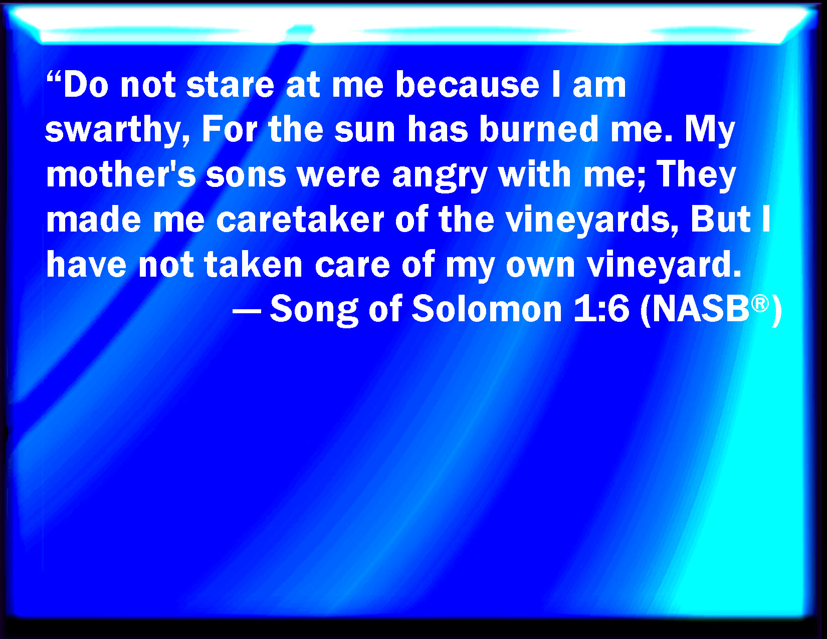 Bible Verse Slide Song of Solomon 1:6 Look not on me, because I am black, because the sun has looked on me: my mother's children were angry with me; they made me the keeper of the vineyards; but my own vineyard have I not kept. KJV: Look not upon me, because I am black, because the sun hath looked upon me: my mother's children were angry with me; they made me the keeper of the vineyards; but mine own vineyard have I not kept. DRB: Do not consider me that I am brown, because the sun hath altered my colour: the sons of my mother have fought against me, they have made me the keeper in the vineyards: my vineyard I have not kept. DBT: Look not upon me, because I am black; Because the sun hath looked upon me. My mother's children were angry with me: They made me keeper of the vineyards; Mine own vineyard have I not kept. ERV: Look not upon me, because I am swarthy, because the sun hath scorched me. My mother's sons were incensed against me, they made me keeper of the vineyards; but mine own vineyard have I not kept. WBT: Look not upon me, because I am black, because the sun hath looked upon me: my mother's children were angry with me; they made me the keeper of the vineyards; but my own vineyard have I not kept. WEB: Don't stare at me because I am dark, because the sun has scorched me. My mother's sons were angry with me. They made me keeper of the vineyards. I haven't kept my own vineyard. YLT: Fear me not, because I am very dark, Because the sun hath scorched me, The sons of my mother were angry with me, They made me keeper of the vineyards, My vineyard — my own — I have not kept.Links Song of Solomon 1:6 NIV • Song of Solomon 1:6 NLT • Song of Solomon 1:6 ESV • Song of Solomon 1:6 NASB • Song of Solomon 1:6 KJV • Song of Solomon 1:6 Interlinear • Song of Solomon 1:6 Commentaries • Song of Solomon 1:6 Parallel Texts • Song of Solomon 1:6 Bible Apps • Song of Solomon 1:6 Parallel • Bible Hub |
