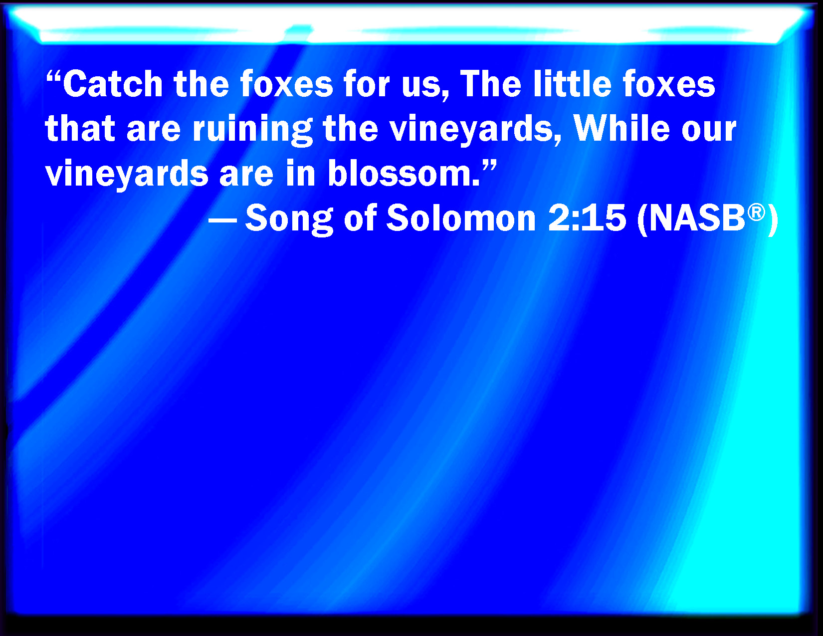 Bible Verse Slide Song of Solomon 2:15 Take us the foxes, the little foxes, that spoil the vines: for our vines have tender grapes. KJV: Take us the foxes, the little foxes, that spoil the vines: for our vines have tender grapes. DRB: Catch us the little foxes that destroy the vines: for our vineyard hath flourished. DBT: Take us the foxes, The little foxes, that spoil the vineyards; For our vineyards are in bloom. ERV: Take us the foxes, the little foxes, that spoil the vineyards; for our vineyards are in blossom. WBT: Take for us the foxes, the little foxes, that spoil the vines: for our vines have tender grapes. WEB: Catch for us the foxes, the little foxes that spoil the vineyards; for our vineyards are in blossom. Beloved YLT: Seize ye for us foxes, Little foxes — destroyers of vineyards, Even our sweet-smelling vineyards.Links Song of Solomon 2:15 NIV • Song of Solomon 2:15 NLT • Song of Solomon 2:15 ESV • Song of Solomon 2:15 NASB • Song of Solomon 2:15 KJV • Song of Solomon 2:15 Interlinear • Song of Solomon 2:15 Commentaries • Song of Solomon 2:15 Parallel Texts • Song of Solomon 2:15 Bible Apps • Song of Solomon 2:15 Parallel • Bible Hub |