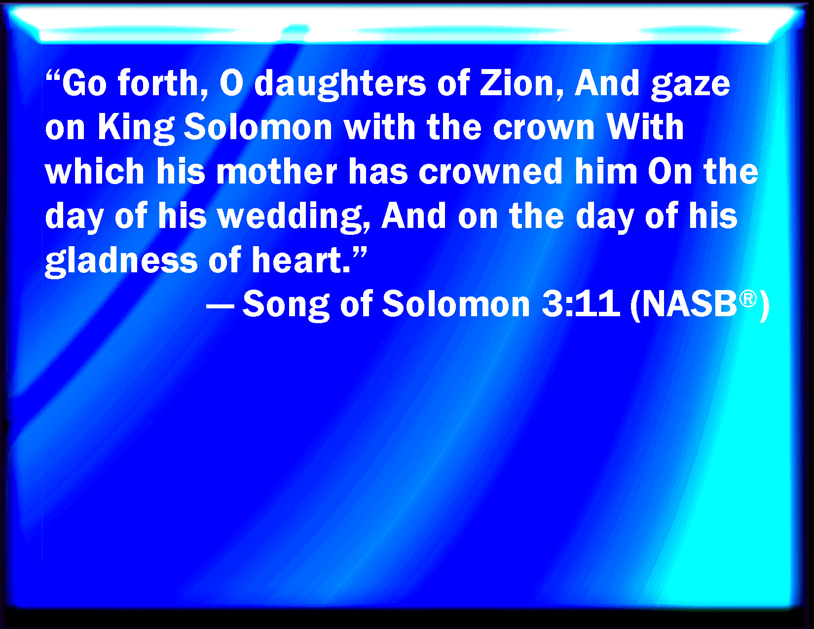 Bible Verse Slide Song of Solomon 3:11 Go forth, O you daughters of Zion, and behold king Solomon with the crown with which his mother crowned him in the day of his espousals, and in the day of the gladness of his heart. KJV: Go forth, O ye daughters of Zion, and behold king Solomon with the crown wherewith his mother crowned him in the day of his espousals, and in the day of the gladness of his heart. DRB: Go forth, ye daughters of Sion, and see king Solomon in the diadem, wherewith his mother crowned him in the day of his espousals, and in the day of the joy of his heart. DBT: Go forth, daughters of Zion, And behold king Solomon With the crown wherewith his mother crowned him In the day of his espousals, And in the day of the gladness of his heart. ERV: Go forth, O ye daughters of Zion, and behold king Solomon, with the crown wherewith his mother hath crowned him in the day of his espousals, and in the day of the gladness of his heart. WBT: Go forth, O ye daughters of Zion, and behold king Solomon with the crown with which his mother crowned him in the day of his espousals, and in the day of the gladness of his heart. WEB: Go forth, you daughters of Zion, and see king Solomon, with the crown with which his mother has crowned him, in the day of his weddings, in the day of the gladness of his heart. Lover YLT: Go forth, and look, ye daughters of Zion, On king Solomon, with the crown, With which his mother crowned him, In the day of his espousals, And in the day of the joy of his heart!Links Song of Solomon 3:11 NIV • Song of Solomon 3:11 NLT • Song of Solomon 3:11 ESV • Song of Solomon 3:11 NASB • Song of Solomon 3:11 KJV • Song of Solomon 3:11 Interlinear • Song of Solomon 3:11 Commentaries • Song of Solomon 3:11 Parallel Texts • Song of Solomon 3:11 Bible Apps • Song of Solomon 3:11 Parallel • Bible Hub |