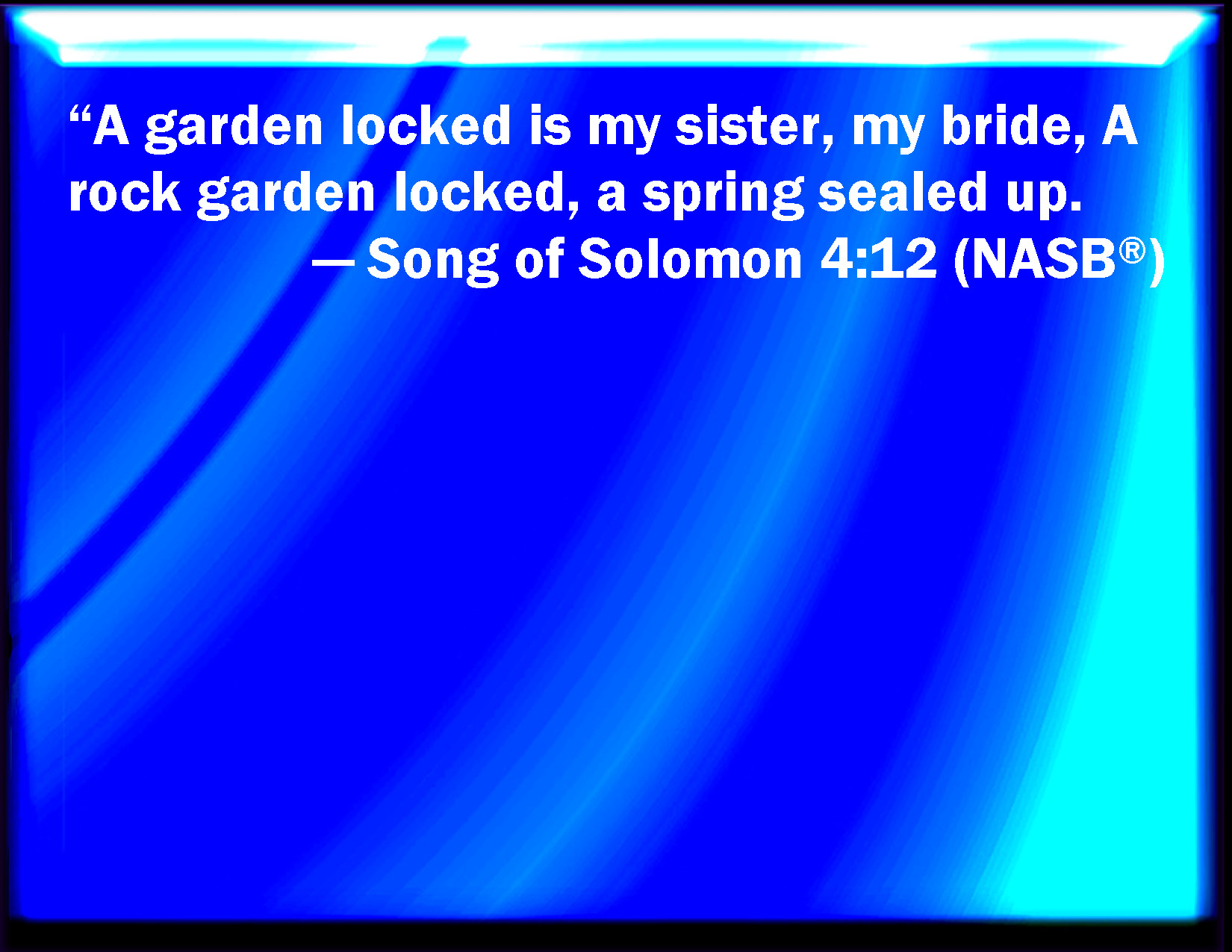 Bible Verse Slide Song of Solomon 4:12 A garden enclosed is my sister, my spouse; a spring shut up, a fountain sealed. KJV: A garden inclosed is my sister, my spouse; a spring shut up, a fountain sealed. DRB: My sister, my spouse, is a garden enclosed, a garden enclosed, a fountain sealed up. DBT: A garden enclosed is my sister, my spouse; A spring shut up, a fountain sealed. ERV: A garden shut up is my sister, my bride; a spring shut up, a fountain sealed. WBT: A garden inclosed is my sister, my spouse; a spring shut up, a fountain sealed. WEB: A locked up garden is my sister, my bride; a locked up spring, a sealed fountain. YLT: A garden shut up is my sister-spouse, A spring shut up — a fountain sealed.Links Song of Solomon 4:12 NIV • Song of Solomon 4:12 NLT • Song of Solomon 4:12 ESV • Song of Solomon 4:12 NASB • Song of Solomon 4:12 KJV • Song of Solomon 4:12 Interlinear • Song of Solomon 4:12 Commentaries • Song of Solomon 4:12 Parallel Texts • Song of Solomon 4:12 Bible Apps • Song of Solomon 4:12 Parallel • Bible Hub |