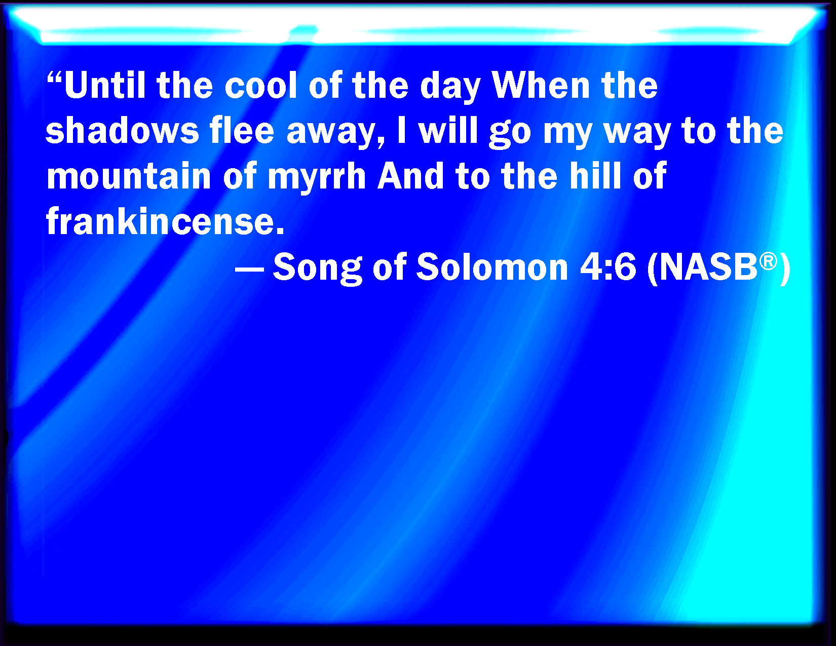Bible Verse Slide Song of Solomon 4:6 Until the day break, and the shadows flee away, I will get me to the mountain of myrrh, and to the hill of frankincense. KJV: Until the day break, and the shadows flee away, I will get me to the mountain of myrrh, and to the hill of frankincense. DRB: Till the day break, and the shadows retire, I will go to the mountain of myrrh, and to the hill of frankincense. DBT: Until the day dawn, and the shadows flee away, I will get me to the mountain of myrrh, And to the hill of frankincense. ERV: Until the day be cool, and the shadows flee away, I will get me to the mountain of myrrh, and to the hill of frankincense. WBT: Until the day shall break, and the shadows flee away, I will repair to the mountain of myrrh, and to the hill of frankincense. WEB: Until the day is cool, and the shadows flee away, I will go to the mountain of myrrh, to the hill of frankincense. YLT: Till the day doth break forth, And the shadows have fled away, I will get me unto the mountain of myrrh, And unto the hill of frankincense.Links Song of Solomon 4:6 NIV • Song of Solomon 4:6 NLT • Song of Solomon 4:6 ESV • Song of Solomon 4:6 NASB • Song of Solomon 4:6 KJV • Song of Solomon 4:6 Interlinear • Song of Solomon 4:6 Commentaries • Song of Solomon 4:6 Parallel Texts • Song of Solomon 4:6 Bible Apps • Song of Solomon 4:6 Parallel • Bible Hub |