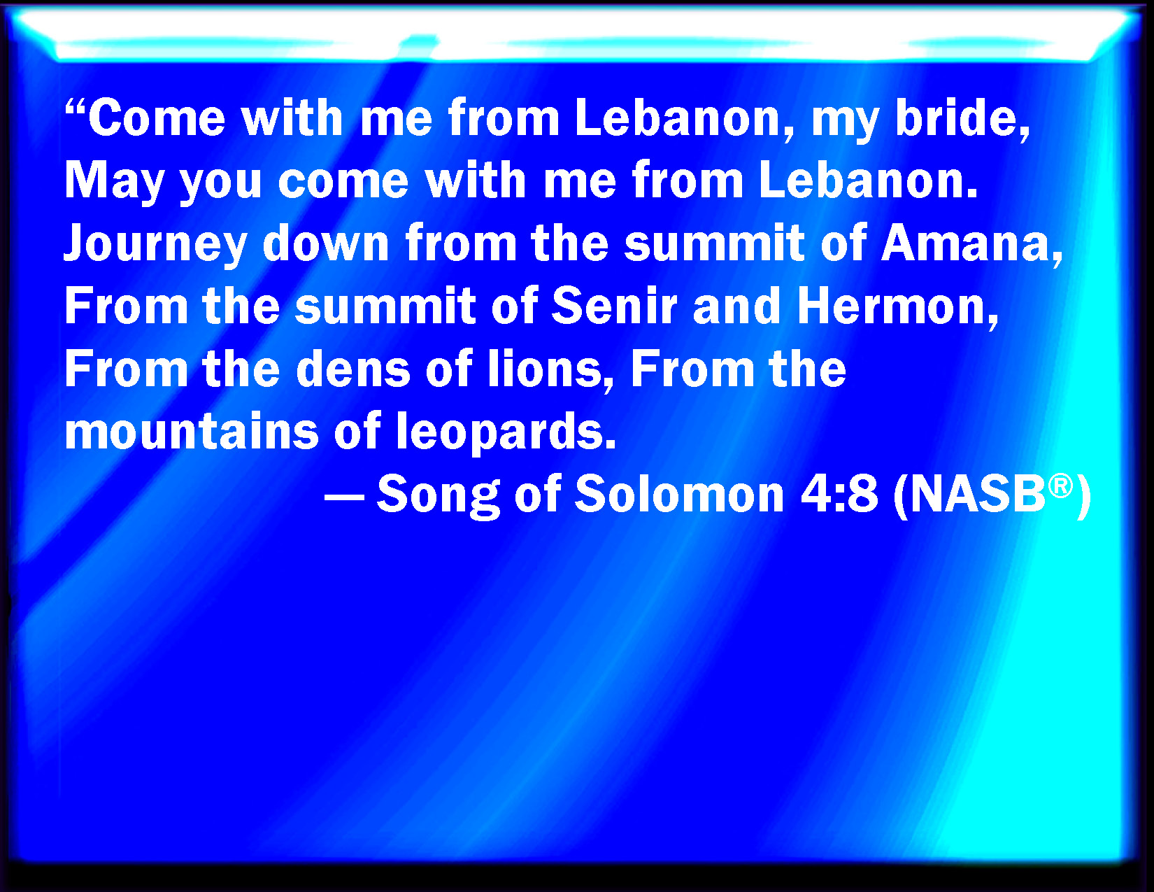 Bible Verse Slide Song of Solomon 4:8 Come with me from Lebanon, my spouse, with me from Lebanon: look from the top of Amana, from the top of Shenir and Hermon, from the lions' dens, from the mountains of the leopards. KJV: Come with me from Lebanon, my spouse, with me from Lebanon: look from the top of Amana, from the top of Shenir and Hermon, from the lions' dens, from the mountains of the leopards. DRB: Come from Libanus, my spouse, come from Libanus, come: thou shalt be crowned from the top of Amana, from the top of Sanir and Hermon, from the dens of the lions, from the mountains of the leopards. DBT: Come with me, from Lebanon, my spouse, With me from Lebanon, Come, look from the top of Amanah, From the top of Senir and Hermon, From the lions' dens, From the mountains of the leopards. ERV: Come with me from Lebanon, my bride, with me from Lebanon: look from the top of Amana, from the top of Senir and Hermon, from the lions' dens, from the mountains of the leopards. WBT: Come with me from Lebanon, my spouse, with me from Lebanon: look from the top of Amana, from the top of Shenir and Hermon, from the lions' dens, from the mountains of the leopards. WEB: Come with me from Lebanon, my bride, with me from Lebanon. Look from the top of Amana, from the top of Senir and Hermon, from the lions' dens, from the mountains of the leopards. YLT: Come from Lebanon, come thou in. Look from the top of Amana, From the top of Shenir and Hermon, From the habitations of lions, From the mountains of leopards.Links Song of Solomon 4:8 NIV • Song of Solomon 4:8 NLT • Song of Solomon 4:8 ESV • Song of Solomon 4:8 NASB • Song of Solomon 4:8 KJV • Song of Solomon 4:8 Interlinear • Song of Solomon 4:8 Commentaries • Song of Solomon 4:8 Parallel Texts • Song of Solomon 4:8 Bible Apps • Song of Solomon 4:8 Parallel • Bible Hub |