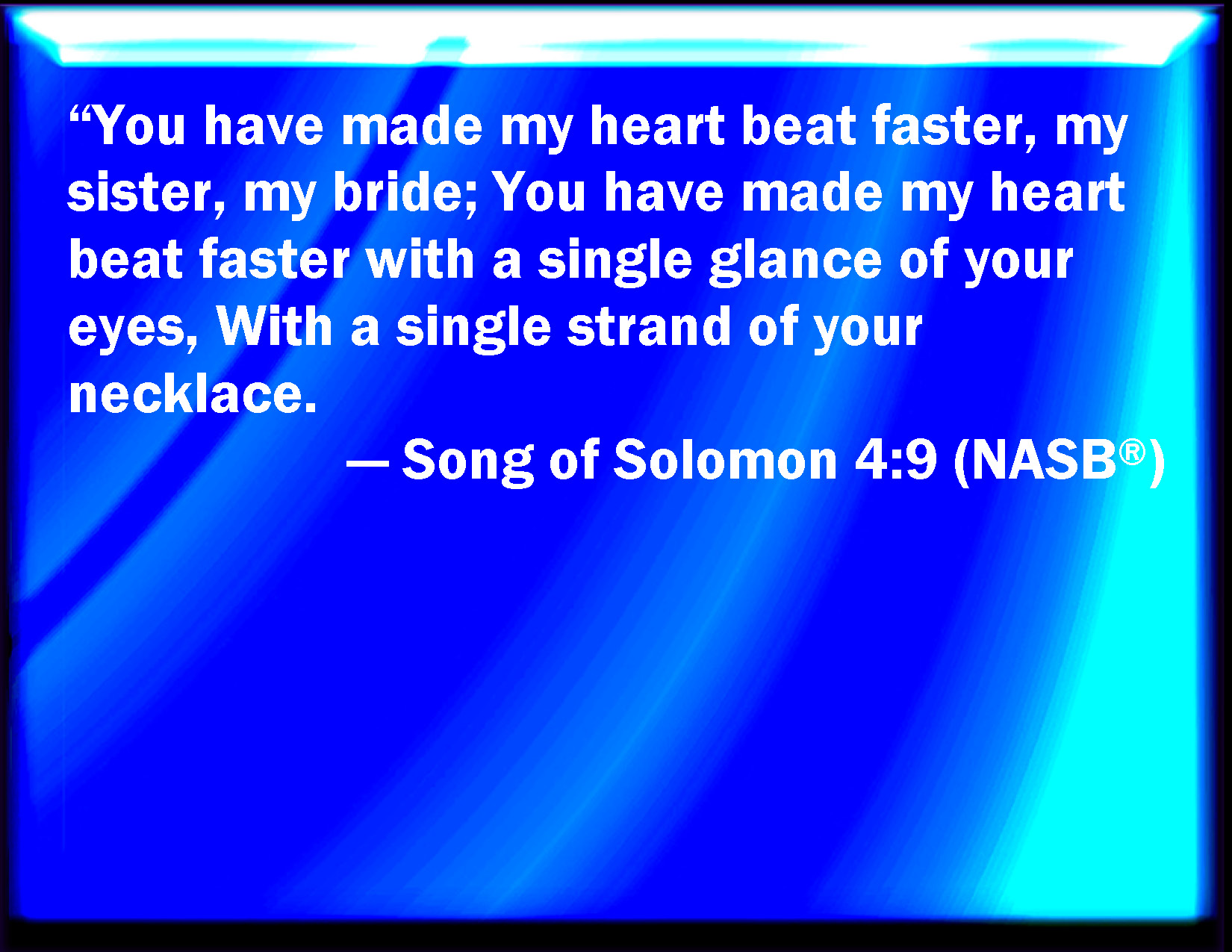 Bible Verse Slide Song of Solomon 4:9 You have ravished my heart, my sister, my spouse; you have ravished my heart with one of your eyes, with one chain of your neck. KJV: Thou hast ravished my heart, my sister, my spouse; thou hast ravished my heart with one of thine eyes, with one chain of thy neck. DRB: Thou hast wounded my heart, my sister, my spouse, thou hast wounded my heart with one of thy eyes, and with one hair of thy neck. DBT: Thou hast ravished my heart, my sister, my spouse; Thou hast ravished my heart with one of thine eyes, With one chain of thy neck. ERV: Thou hast ravished my heart, my sister, my bride; thou hast ravished my heart with one of thine eyes, with one chain of thy neck. WBT: Thou hast ravished my heart, my sister, my spouse; thou hast ravished my heart with one of thy eyes, with one chain of thy neck. WEB: You have ravished my heart, my sister, my bride. You have ravished my heart with one of your eyes, with one chain of your neck. YLT: Thou hast emboldened me, my sister-spouse, Emboldened me with one of thine eyes, With one chain of thy neck.Links Song of Solomon 4:9 NIV • Song of Solomon 4:9 NLT • Song of Solomon 4:9 ESV • Song of Solomon 4:9 NASB • Song of Solomon 4:9 KJV • Song of Solomon 4:9 Interlinear • Song of Solomon 4:9 Commentaries • Song of Solomon 4:9 Parallel Texts • Song of Solomon 4:9 Bible Apps • Song of Solomon 4:9 Parallel • Bible Hub |
