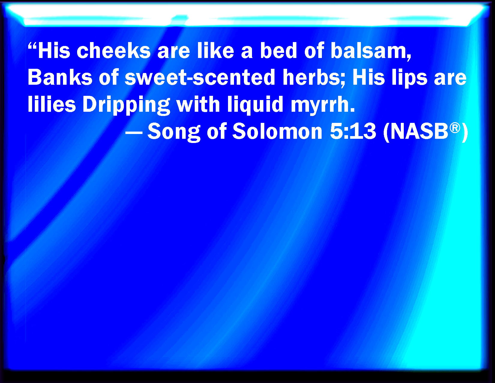 Bible Verse Slide Song of Solomon 5:13 His cheeks are as a bed of spices, as sweet flowers: his lips like lilies, dropping sweet smelling myrrh. KJV: His cheeks are as a bed of spices, as sweet flowers: his lips like lilies, dropping sweet smelling myrrh. DRB: His cheeks are as beds of aromatical spices set by the perfumers. His lips are as lilies dropping choice myrrb. DBT: His cheeks are as a bed of spices, raised beds of sweet plants; His lips lilies, dropping liquid myrrh. ERV: His cheeks are as a bed of spices, as banks of sweet herbs: his lips are as lilies, dropping liquid myrrh. WBT: His cheeks are as a bed of spices, as sweet flowers: his lips like lilies, dropping sweet-smelling myrrh. WEB: His cheeks are like a bed of spices with towers of perfumes. His lips are like lilies, dropping liquid myrrh. YLT: His cheeks as a bed of the spice, towers of perfumes, His lips are lilies, dropping flowing myrrh,Links Song of Solomon 5:13 NIV • Song of Solomon 5:13 NLT • Song of Solomon 5:13 ESV • Song of Solomon 5:13 NASB • Song of Solomon 5:13 KJV • Song of Solomon 5:13 Interlinear • Song of Solomon 5:13 Commentaries • Song of Solomon 5:13 Parallel Texts • Song of Solomon 5:13 Bible Apps • Song of Solomon 5:13 Parallel • Bible Hub |