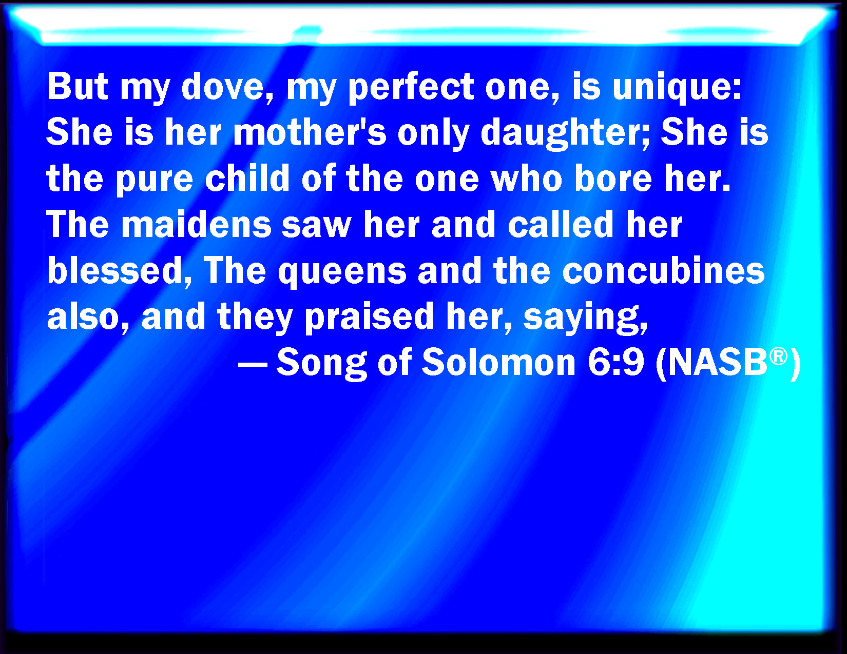 Bible Verse Slide Song of Solomon 6:9 My dove, my undefiled is but one; she is the only one of her mother, she is the choice one of her that bore her. The daughters saw her, and blessed her; yes, the queens and the concubines, and they praised her. KJV: My dove, my undefiled is but one; she is the only one of her mother, she is the choice one of her that bare her. The daughters saw her, and blessed her; yea, the queens and the concubines, and they praised her. DRB: One is my dove, my perfect one is but one, she is the only one of her mother, the chosen of her that bore her. The daughters saw her, and declared her most blessed: the queens and concubines, and they praised her. DBT: My dove, mine undefiled, is but one; She is the only one of her mother, She is the choice one of her that bore her. The daughters saw her, and they called her blessed; The queens and the concubines, and they praised her. ERV: My dove, my undefiled, is but one; she is the only one of her mother; she is the choice one of her that bare her. The daughters saw her, and called her blessed; yea, the queens and the concubines, and they praised her. WBT: My dove, my undefiled is but one; she is the only one of her mother, she is the choice one of her that bore her. The daughters saw her, and blessed her; yes, the queens and the concubines, and they praised her. WEB: My dove, my perfect one, is unique. She is her mother's only daughter. She is the favorite one of her who bore her. The daughters saw her, and called her blessed; the queens and the concubines, and they praised her. YLT: One is my dove, my perfect one, One she is of her mother, The choice one she is of her that bare her, Daughters saw, and pronounce her happy, Queens and concubines, and they praise her.Links Song of Solomon 6:9 NIV • Song of Solomon 6:9 NLT • Song of Solomon 6:9 ESV • Song of Solomon 6:9 NASB • Song of Solomon 6:9 KJV • Song of Solomon 6:9 Interlinear • Song of Solomon 6:9 Commentaries • Song of Solomon 6:9 Parallel Texts • Song of Solomon 6:9 Bible Apps • Song of Solomon 6:9 Parallel • Bible Hub |
