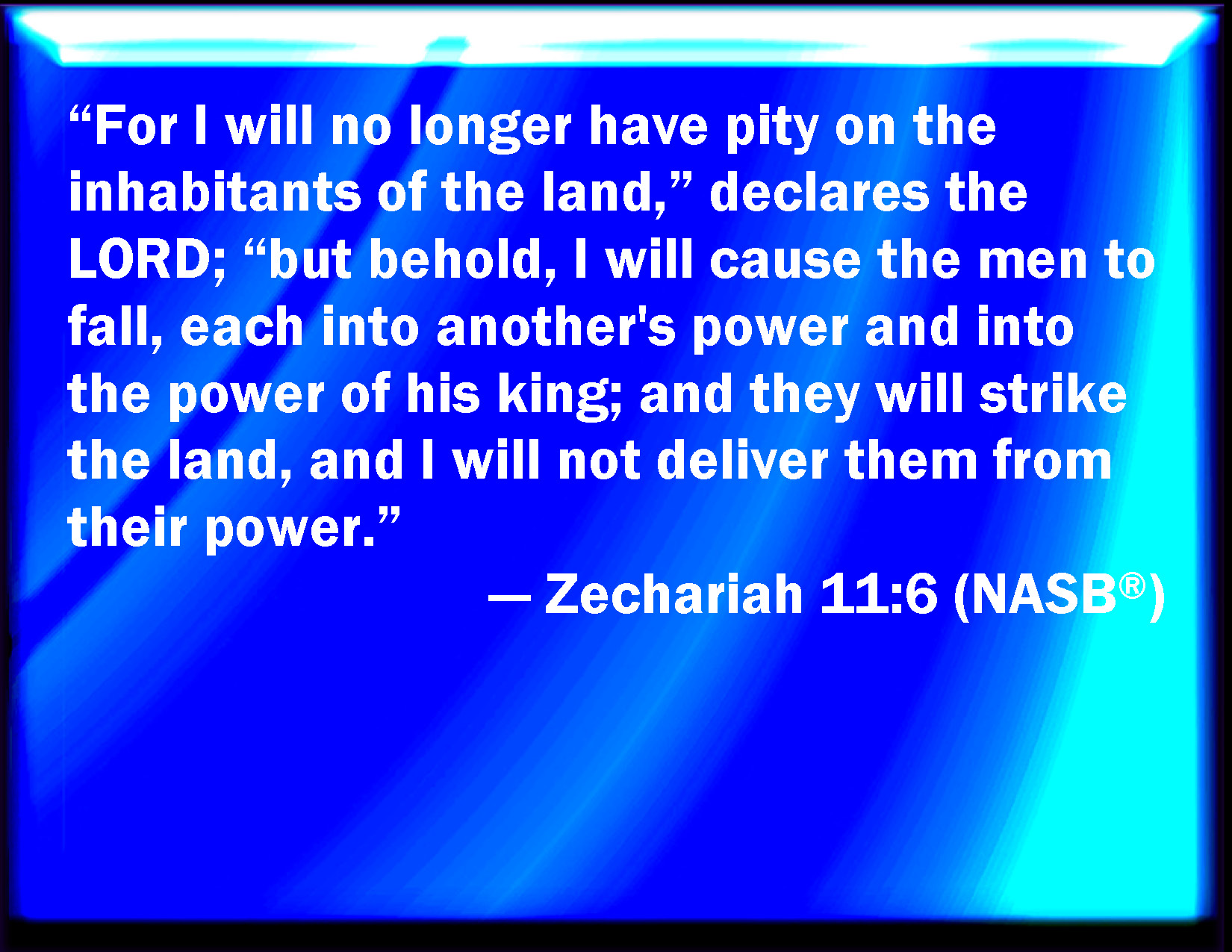 Bible Verse Slide Zechariah 11:6 For I will no more pity the inhabitants of the land, said the LORD: but, see, I will deliver the men every one into his neighbor's hand, and into the hand of his king: and they shall smite the land, and out of their hand I will not deliver them. KJV: For I will no more pity the inhabitants of the land, saith the LORD: but, lo, I will deliver the men every one into his neighbour's hand, and into the hand of his king: and they shall smite the land, and out of their hand I will not deliver them. DRB: And I will no more spare the inhabitants of the land, saith the Lord: behold I will deliver the men, every one into his neighbour's hand, and into the hand of his king: and they shall destroy the land, and I will not deliver it out of their hand. DBT: For I will no more pity the inhabitants of the land, saith Jehovah, and behold, I will deliver men, every one into his neighbour's hand, and into the hand of his king; and they shall smite the land, and I will not deliver out of their hand. ERV: For I will no more pity the inhabitants of the land, saith the LORD: but, lo, I will deliver the men every one into his neighbour's hand, and into the hand of his king: and they shall smite the land, and out of their hand I will not deliver them. WBT: For I will no more pity the inhabitants of the land, saith the LORD: but lo, I will deliver the men every one into his neighbor's hand, and into the hand of his king: and they shall smite the land, and out of their hand I will not deliver them. WEB: For I will no more pity the inhabitants of the land," says Yahweh; "but, behold, I will deliver the men everyone into his neighbor's hand, and into the hand of his king. They will strike the land, and out of their hand I will not deliver them." YLT: For I have pity no more on inhabitants of the land, An affirmation of Jehovah, And lo, I am causing man to come forth, Each into the hand of his neighbour, And into the hand of his king, And they have beaten down the land, And I do not deliver out of their hand.'Links Zechariah 11:6 NIV • Zechariah 11:6 NLT • Zechariah 11:6 ESV • Zechariah 11:6 NASB • Zechariah 11:6 KJV • Zechariah 11:6 Interlinear • Zechariah 11:6 Commentaries • Zechariah 11:6 Parallel Texts • Zechariah 11:6 Bible Apps • Zechariah 11:6 Parallel • Bible Hub |